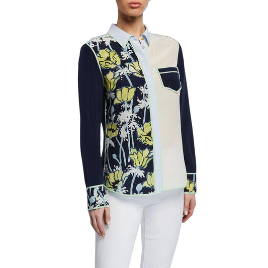 TORY BURCH Printed Contrast Silk Shirt in Navy Poppies Bloom 4