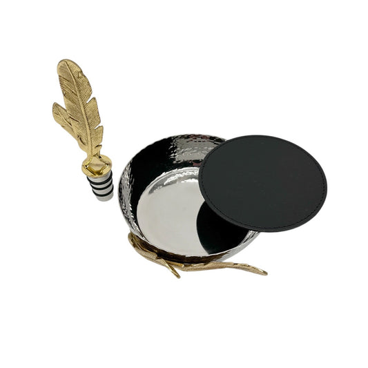 MICHAEL ARAM Gold Feather Coaster & Wine Stopper Set