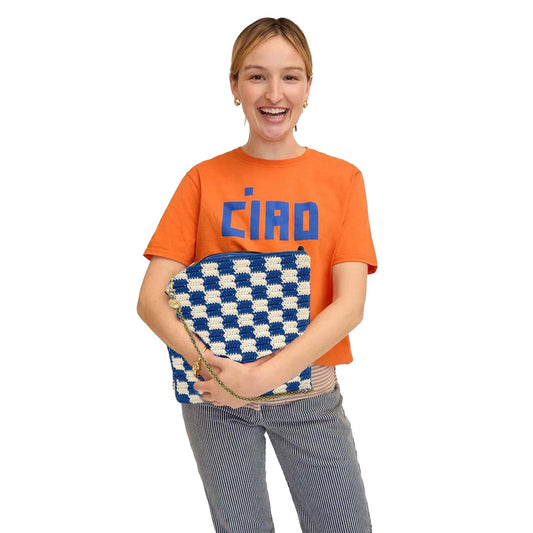 CLARE V. Foldover Clutch in Cobalt & Cream Crochet with Chain Shoulder Strap