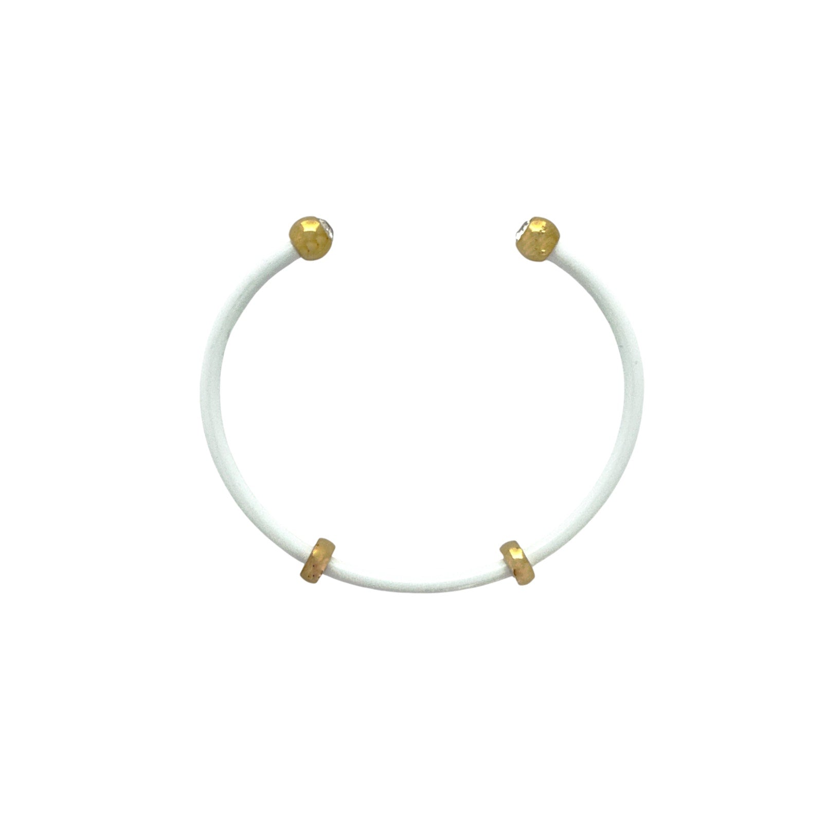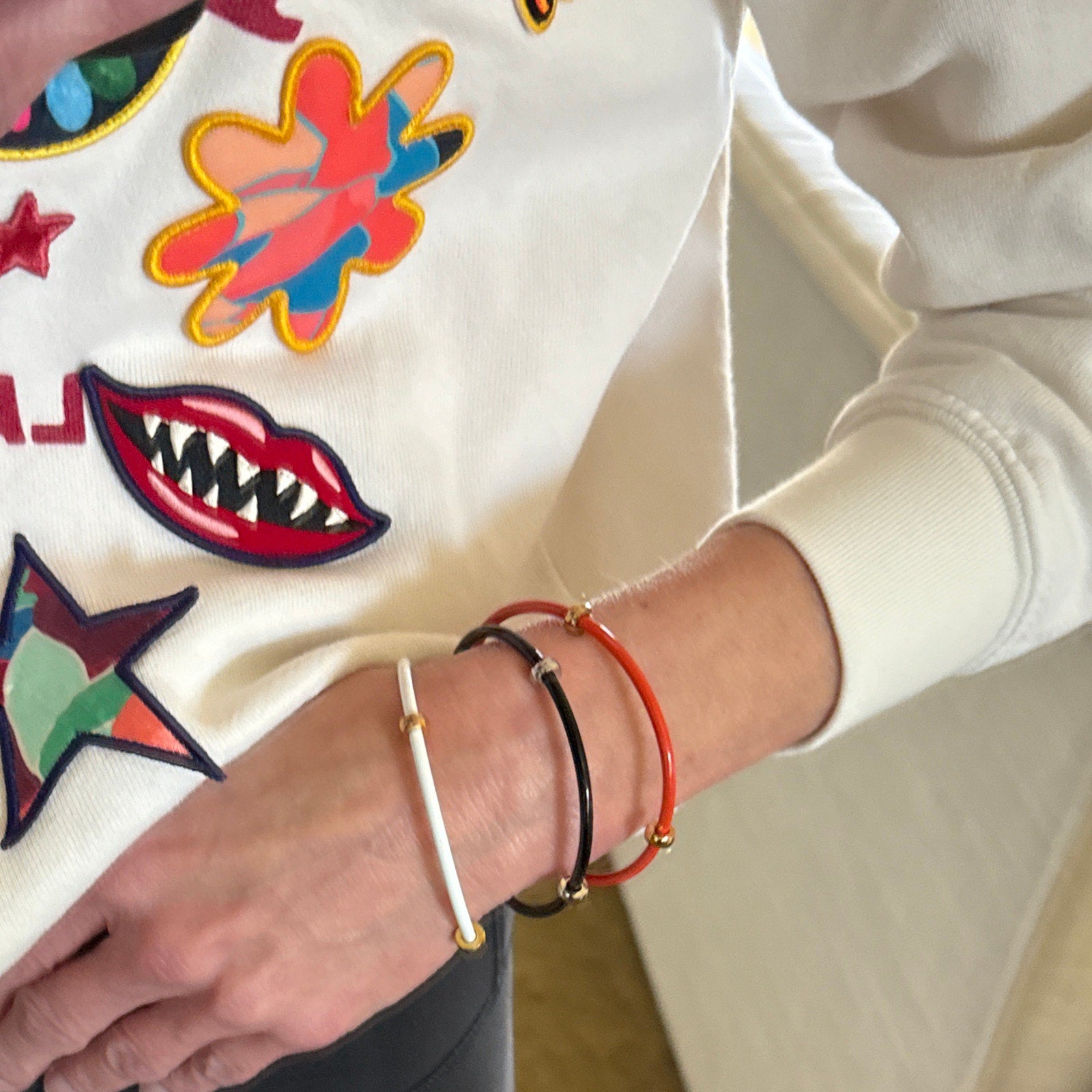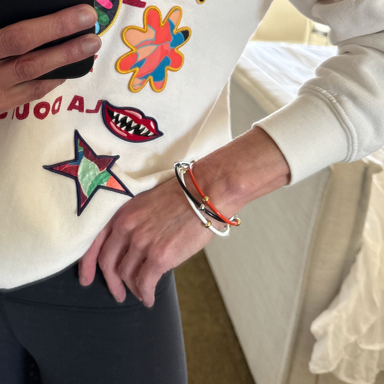 *The images depicting all three colorways serve as a demonstration. This listing pertains to a single bangle, each is sold individually. Available colors: Coral Red, Black, & White.