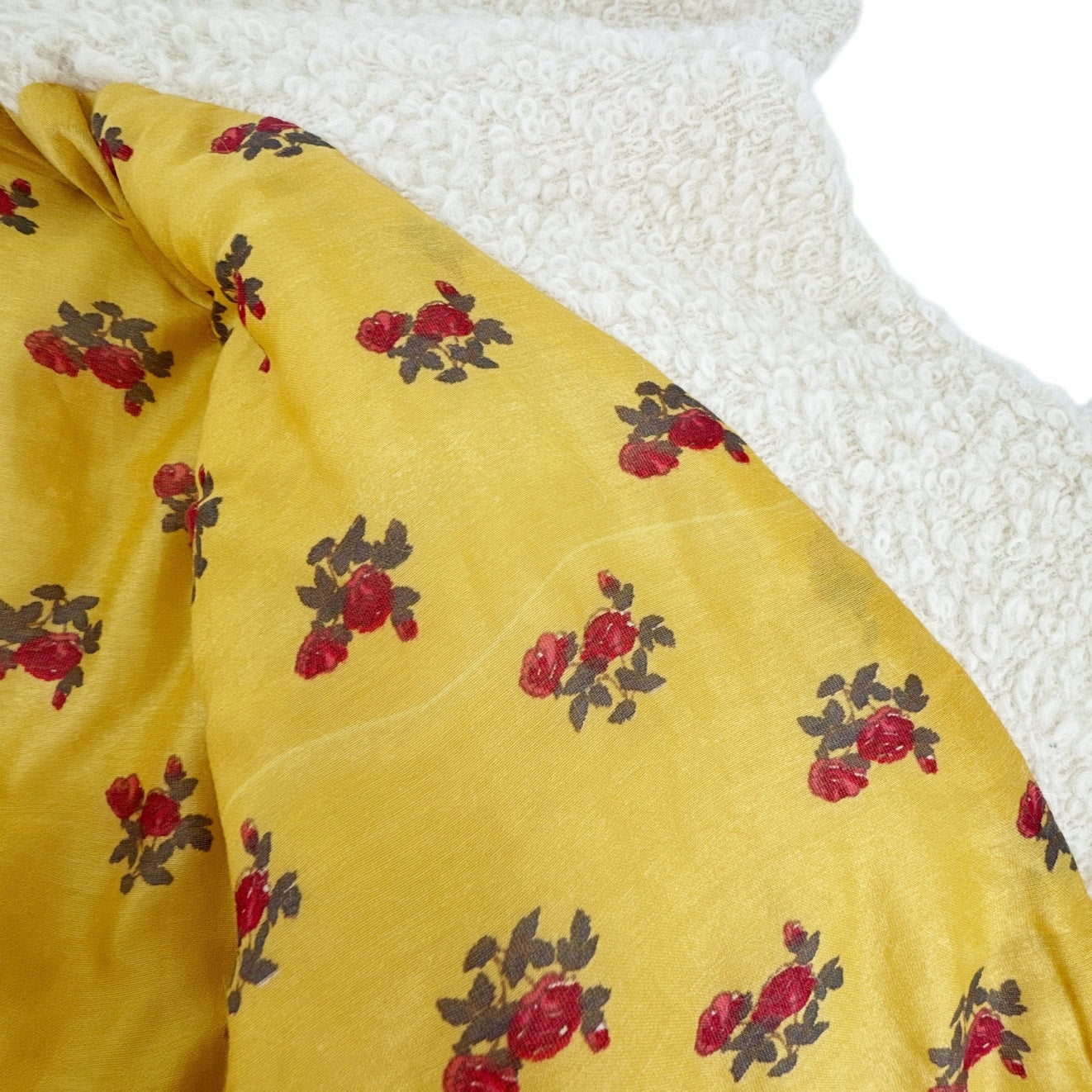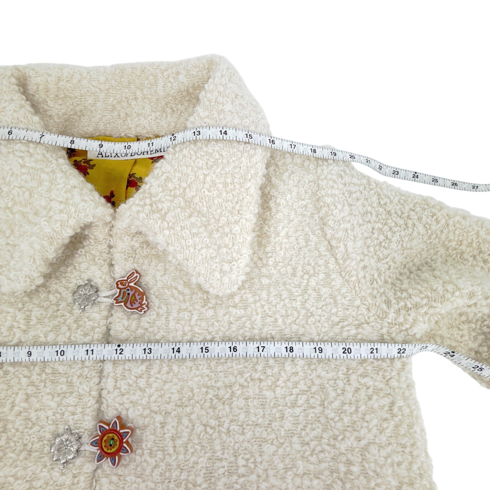 Crafted from an incredible knitted alpaca wool from Italy, this cropped jacket has an oversized collar and cotton-silk floral lining. The chubby-inspired jacket has loop closures featuring silver metal flowers and hand-painted buttons by Alix's mother, ceramist Daphné Verley.
