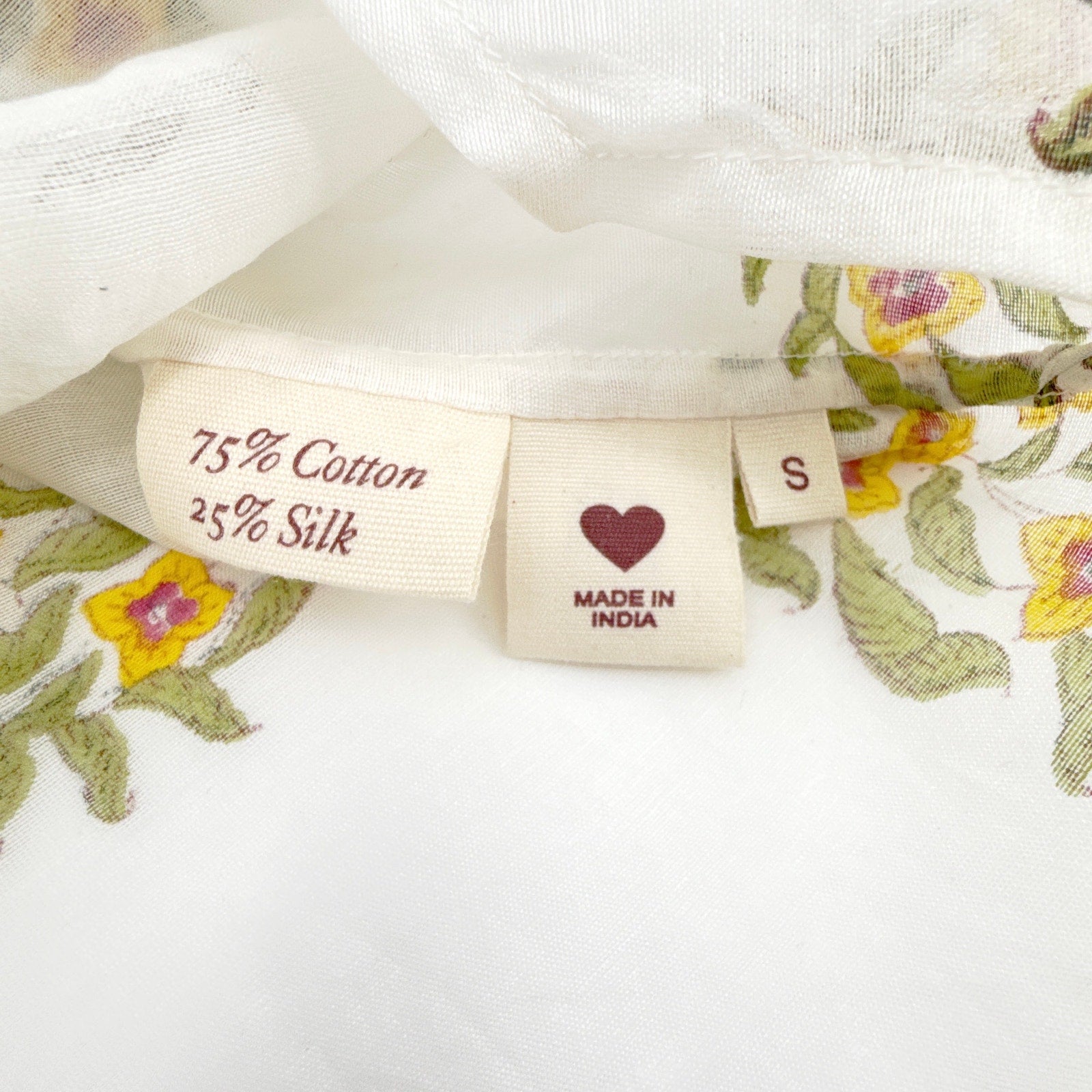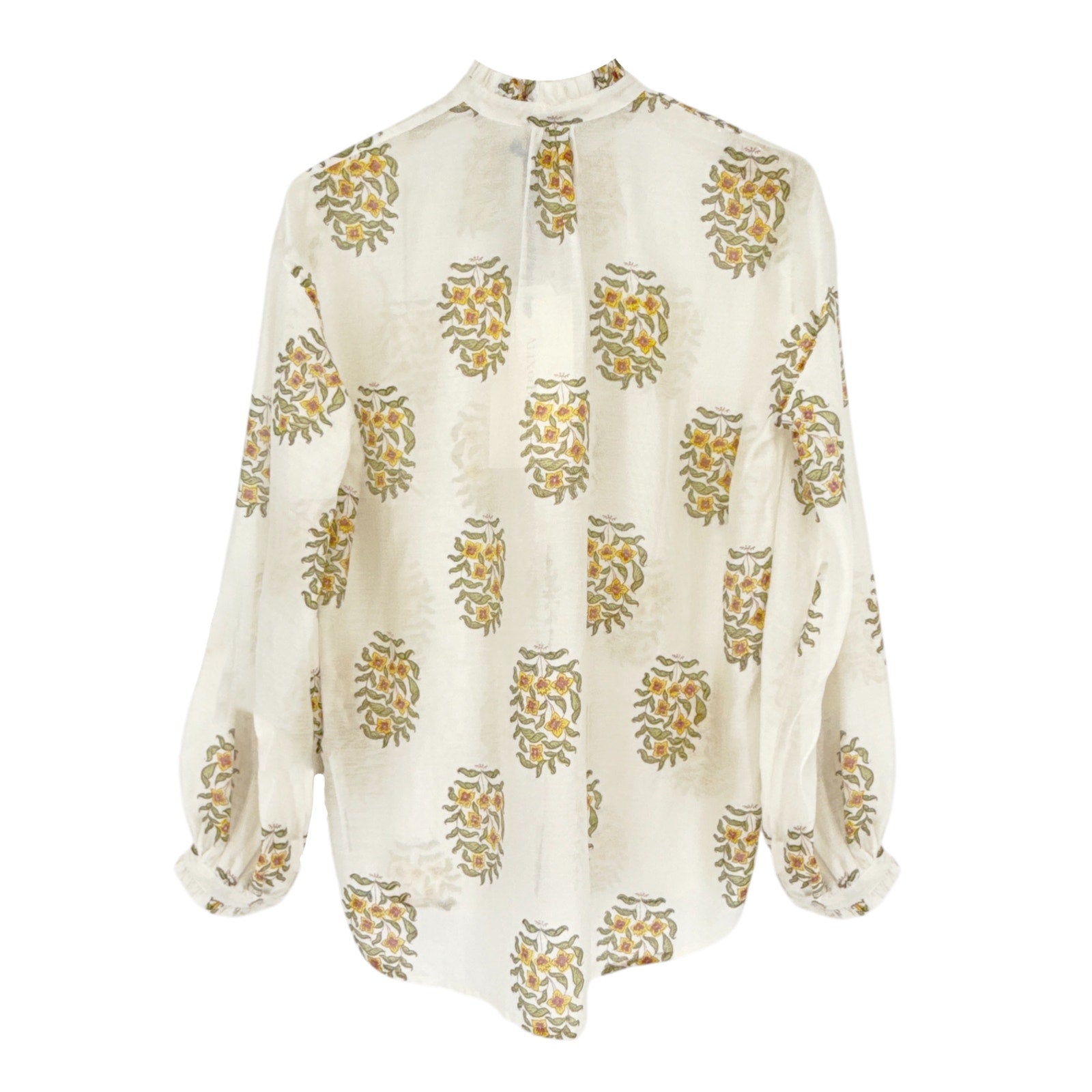 Block-printed by hand with floral print, our cotton silk shirt has a ruffled collar and cuffs. The lightweight shirt has a mother-of-pearl button front and dramatically gathered sleeves.