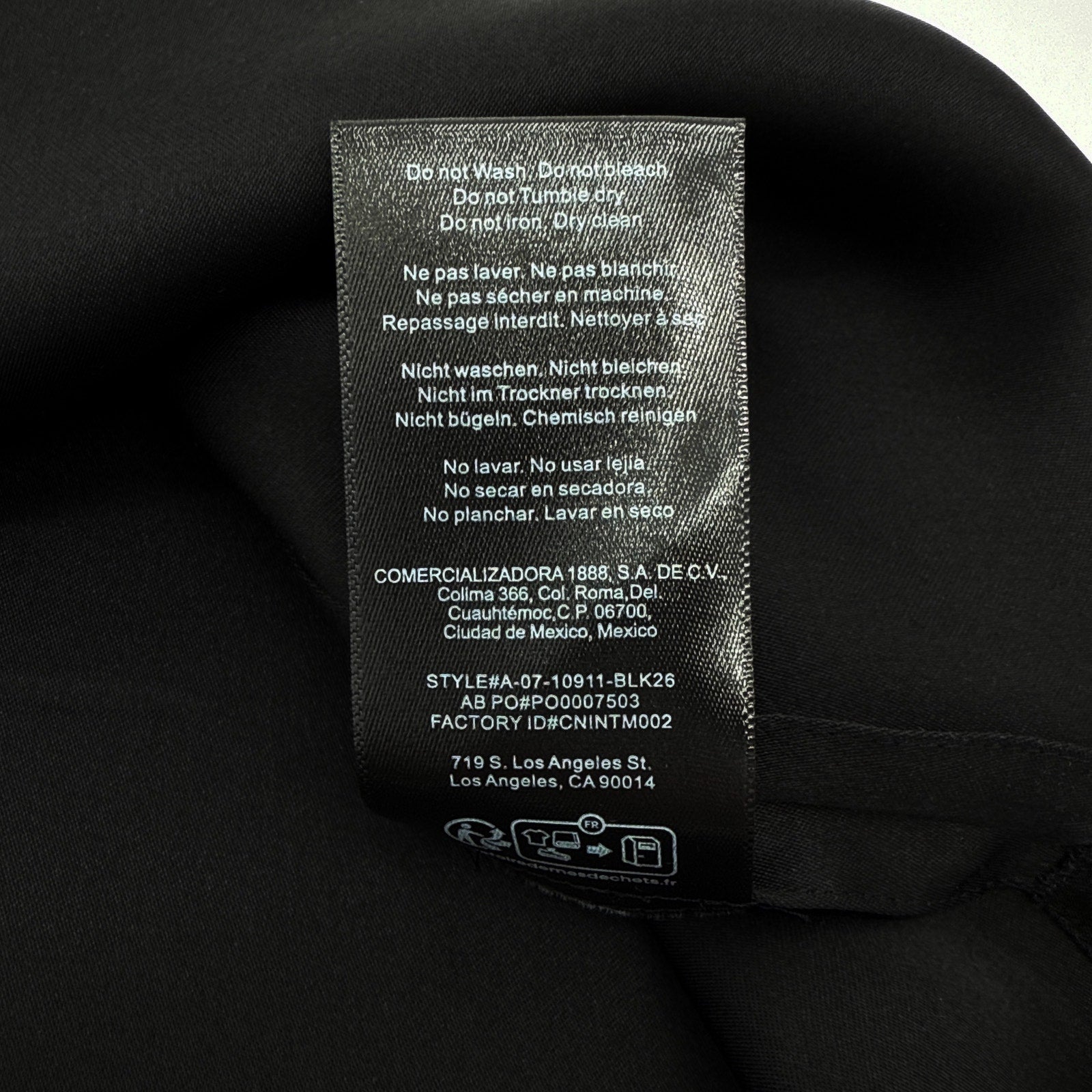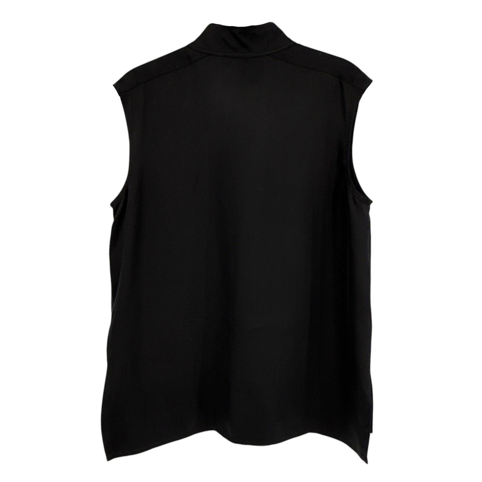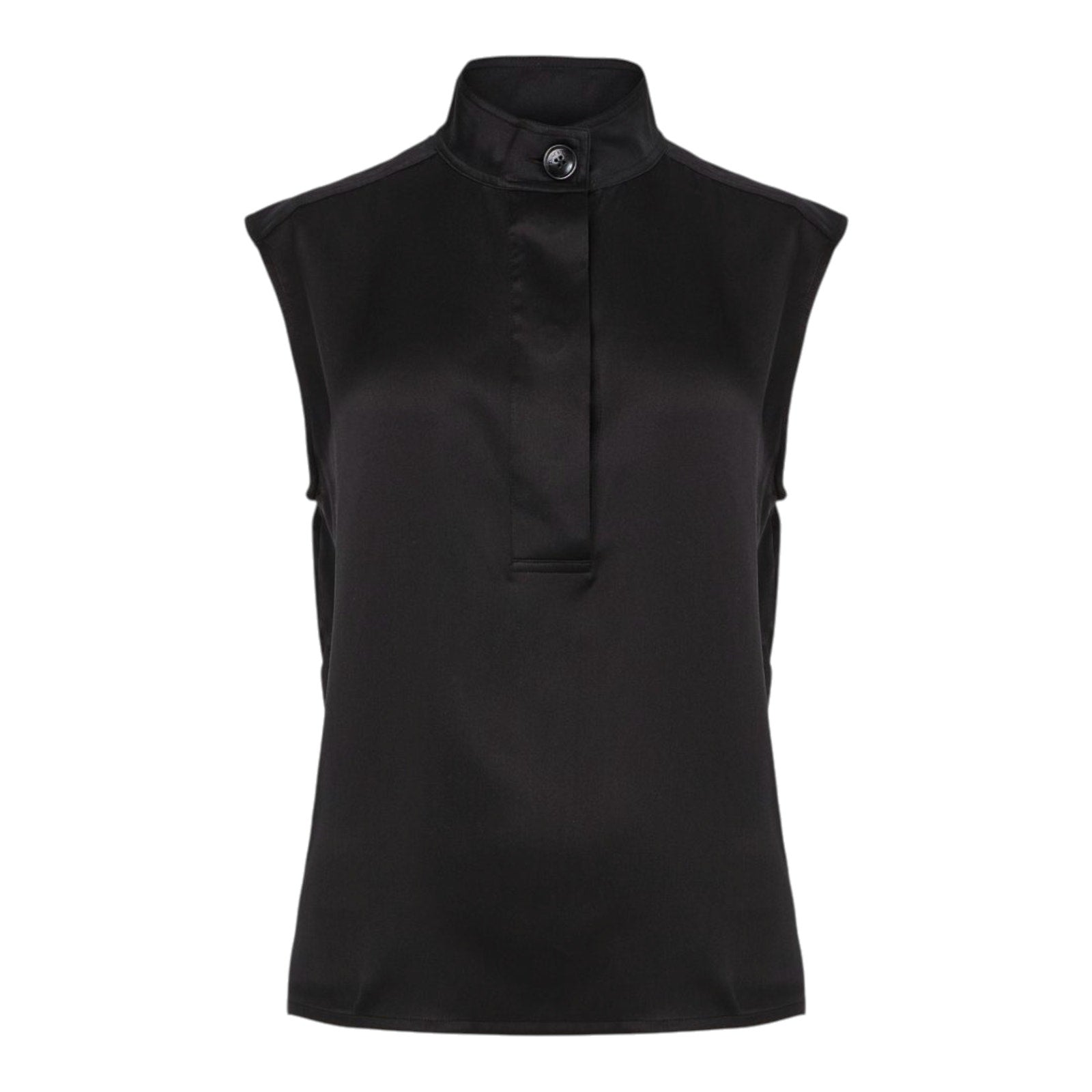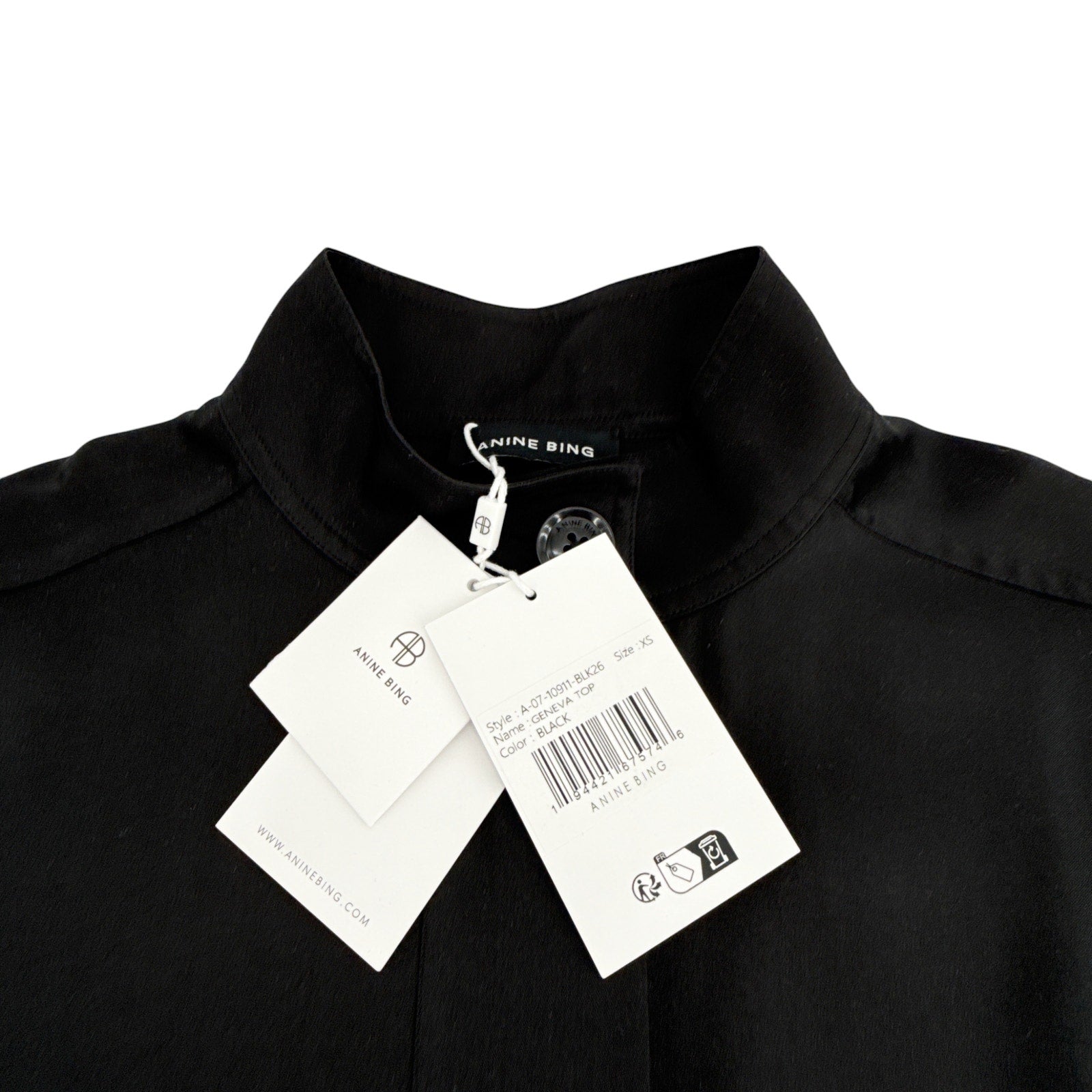 The Geneva Top is crafted in a lightweight silk-rayon blend. Its utility-inspired silhouette features a stand collar, concealed front placket with tonal branded buttons.