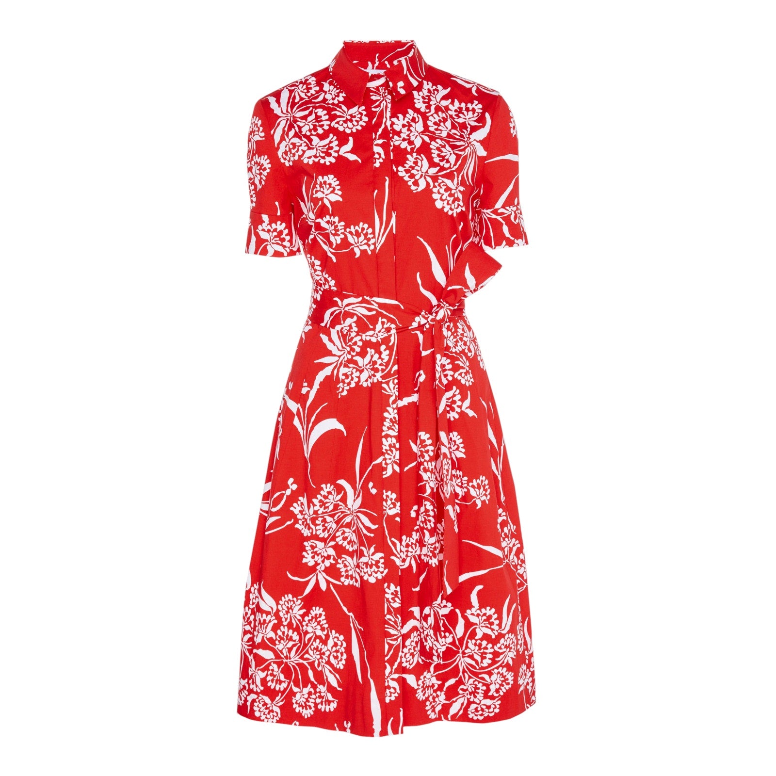 Showcasing a beautiful floral print, this elegant shirt dress is crafted from stretch-cotton with short sleeves and a knee length hem.