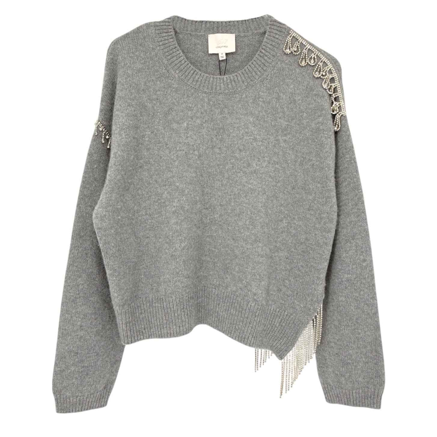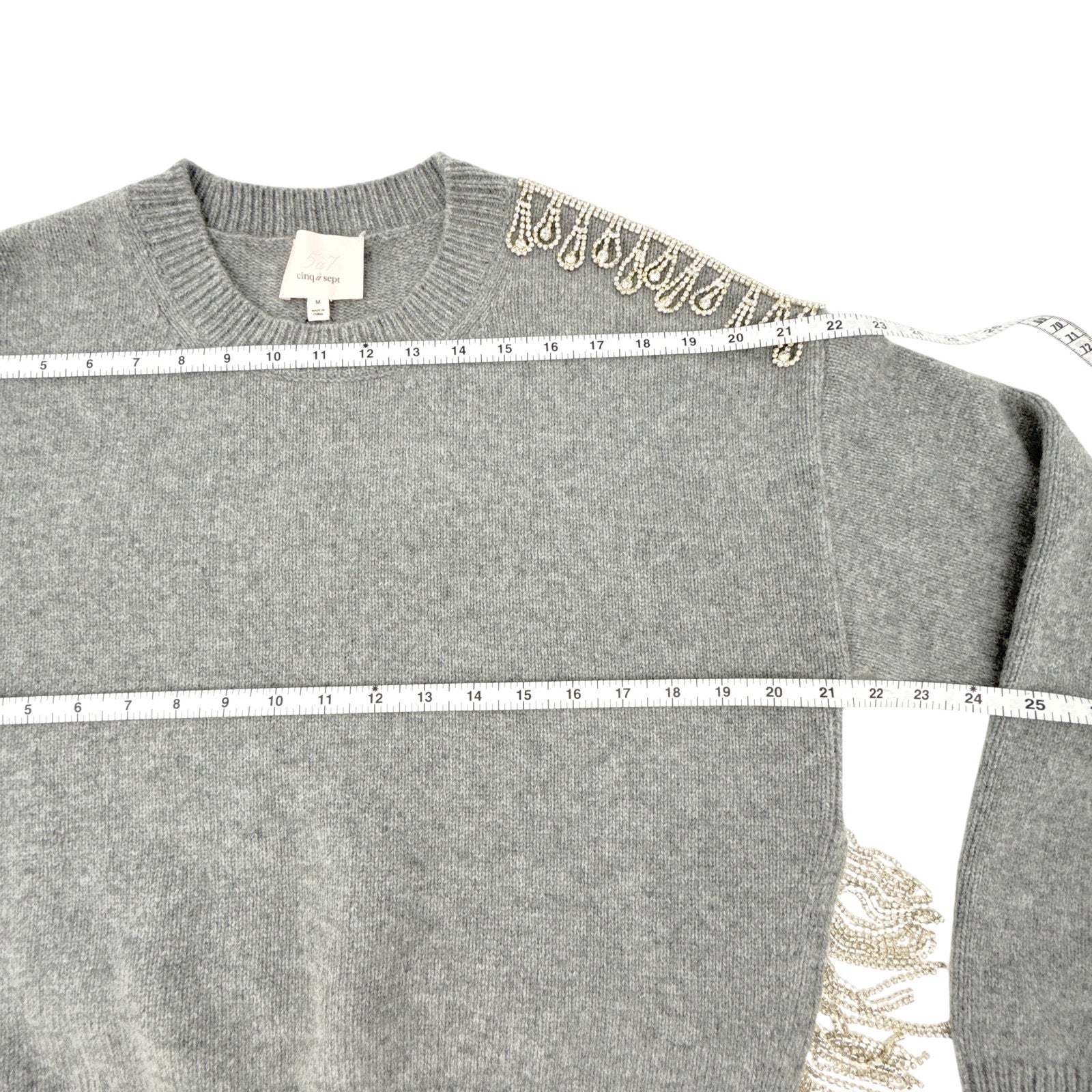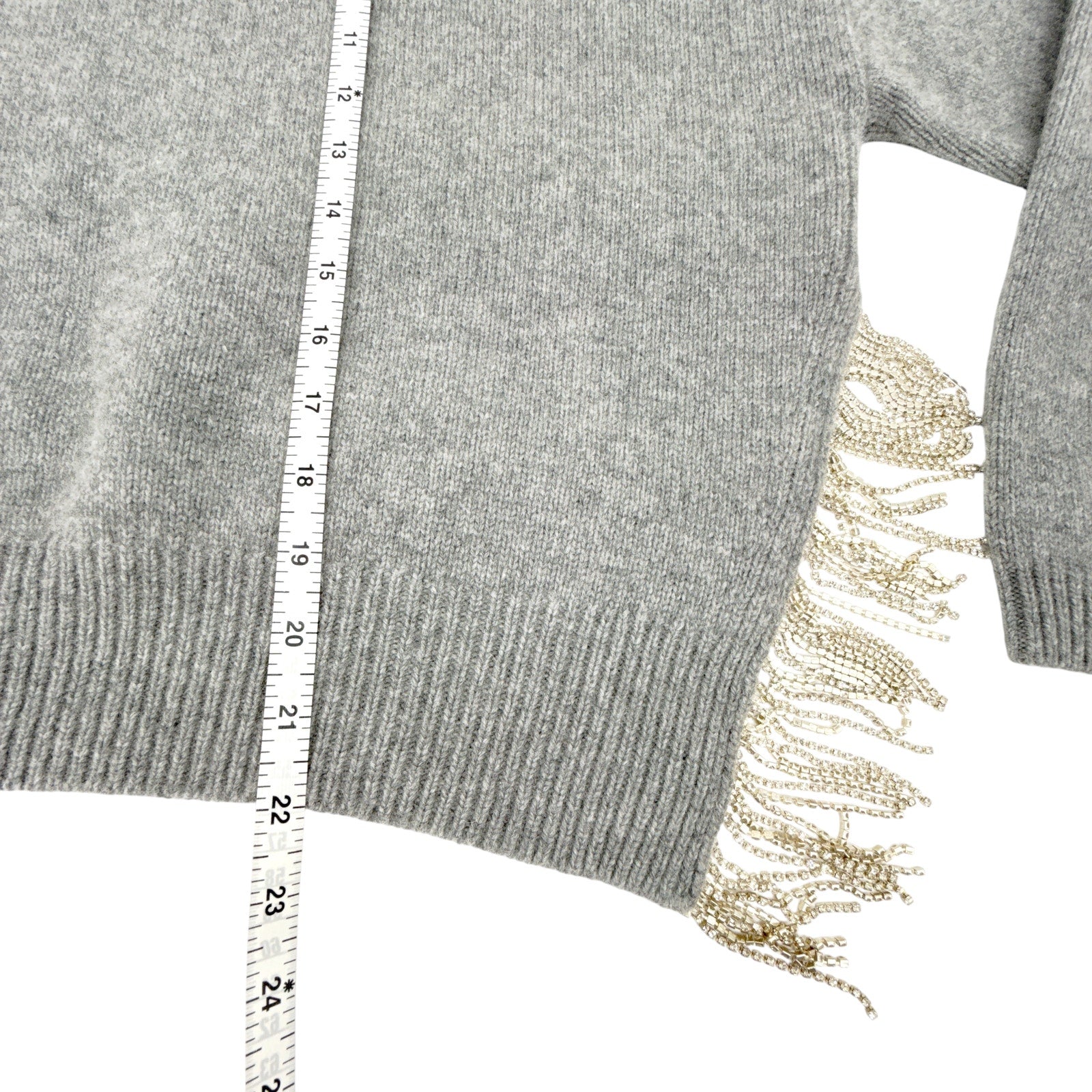 Liliana rhinestone-fringe jumper from CINQ A SEPT featuring heather grey, wool-cashmere blend, knitted construction, rhinestone embellishment, fringe detailing, ribbed edge, drop shoulder, side slit, crew neck, long sleeves and straight hem.