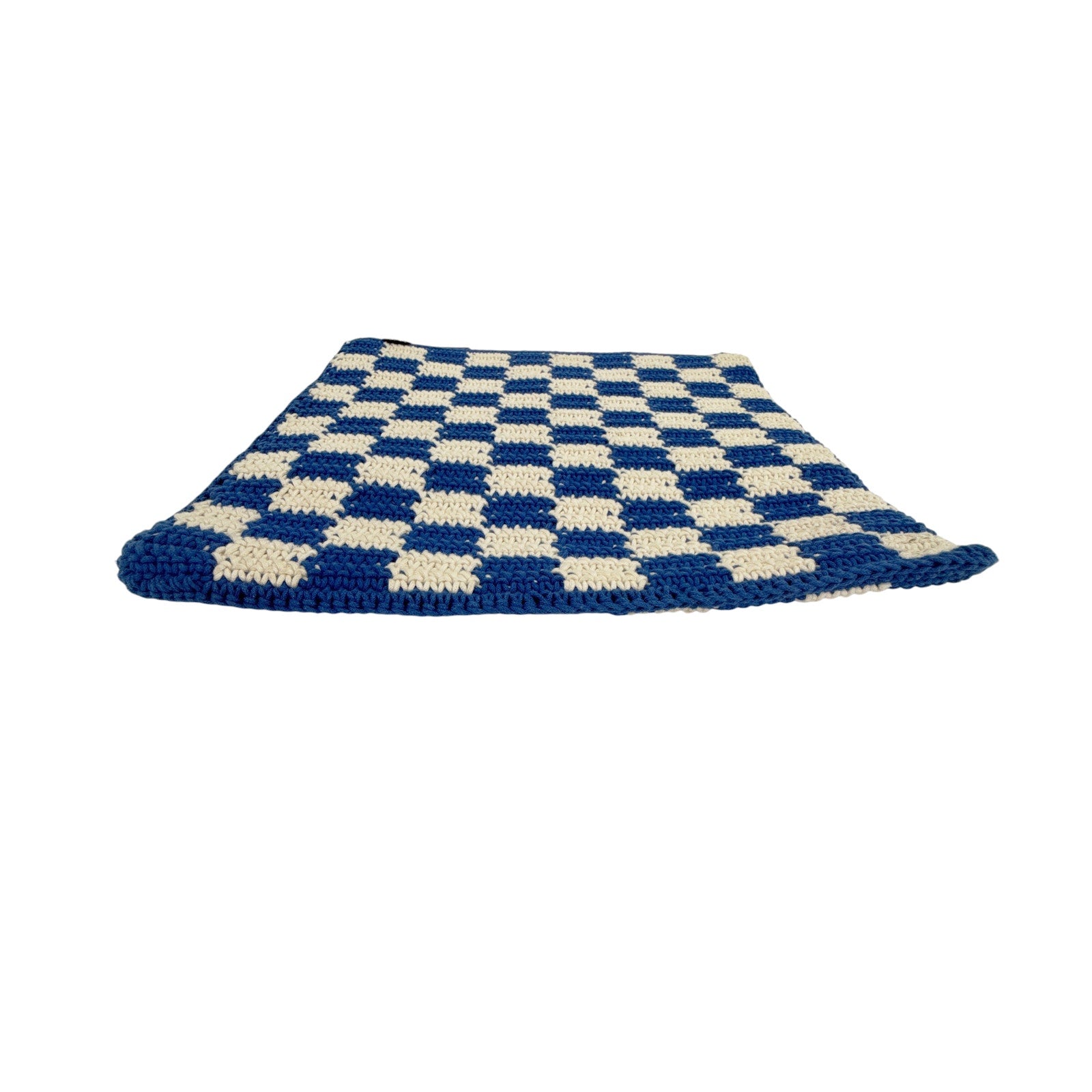 CLARE V. Foldover Clutch in Cobalt & Cream Crochet with Chain Shoulder Strap