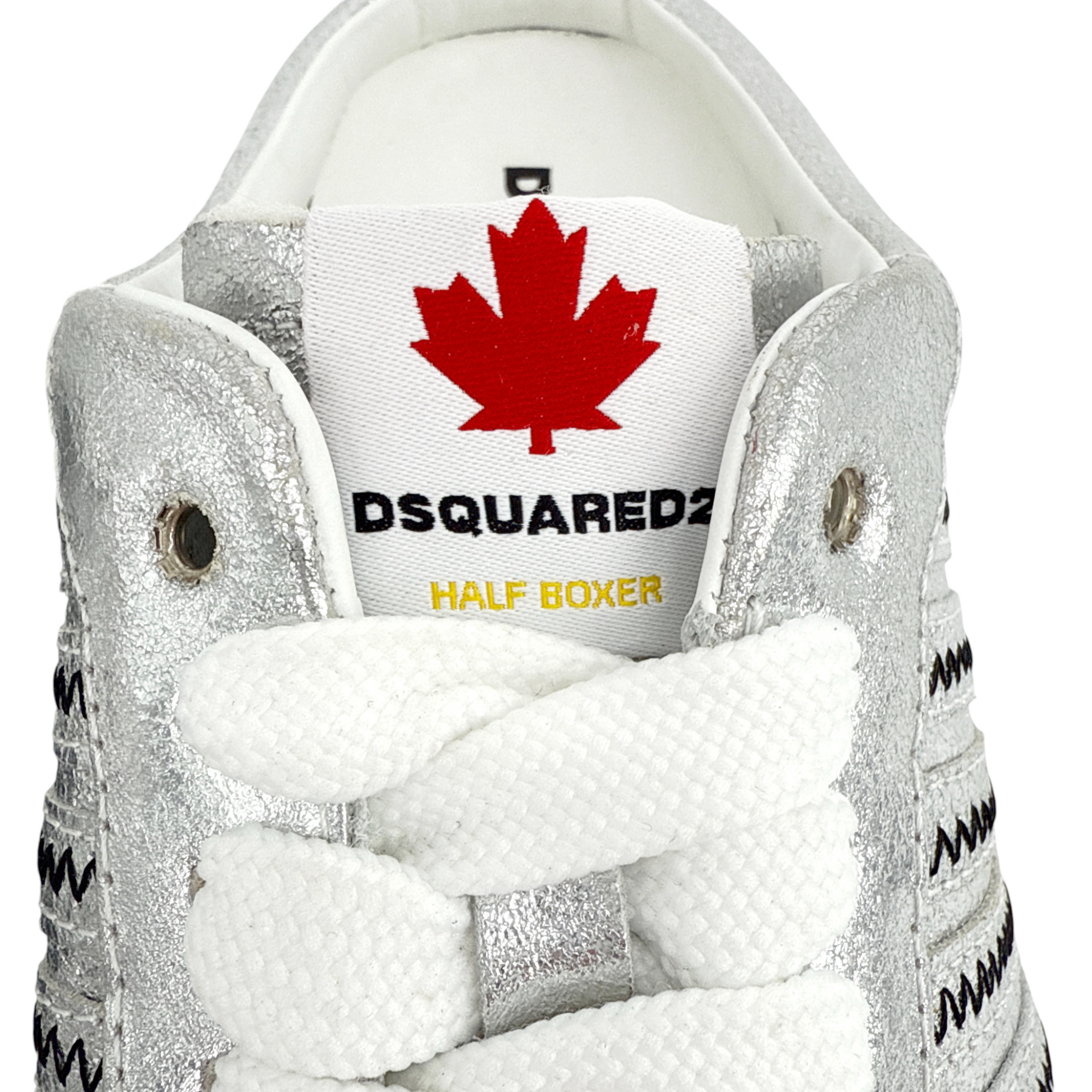 The products we have to offer at Dsquared2 will surely meet your most creative desires in fashion, and most importantly speak to you! These are silver boxer slip-on sneakers for women from Dsquared2. Crafted from the best calf leather, these sneakers feature a black lace design with the signature maple leaf motif and embossed logo print on the white rubber sole.