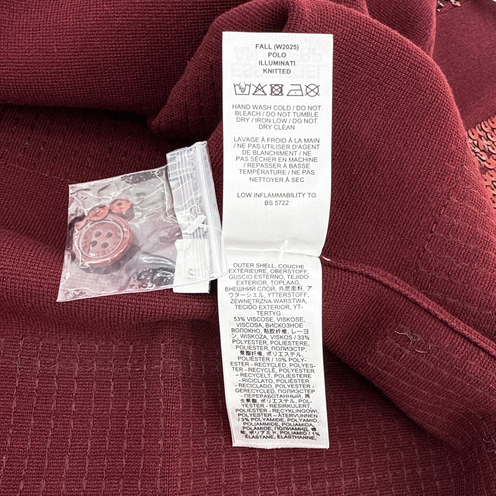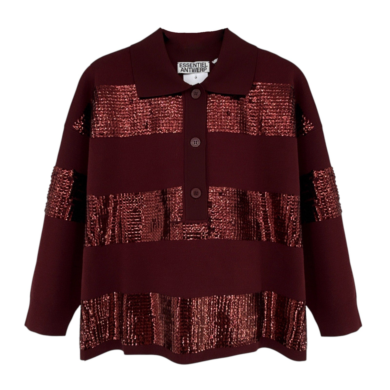 ESSENTIEL ANTWERP Illuminati Sequin Striped Polo Shirt in Wine S