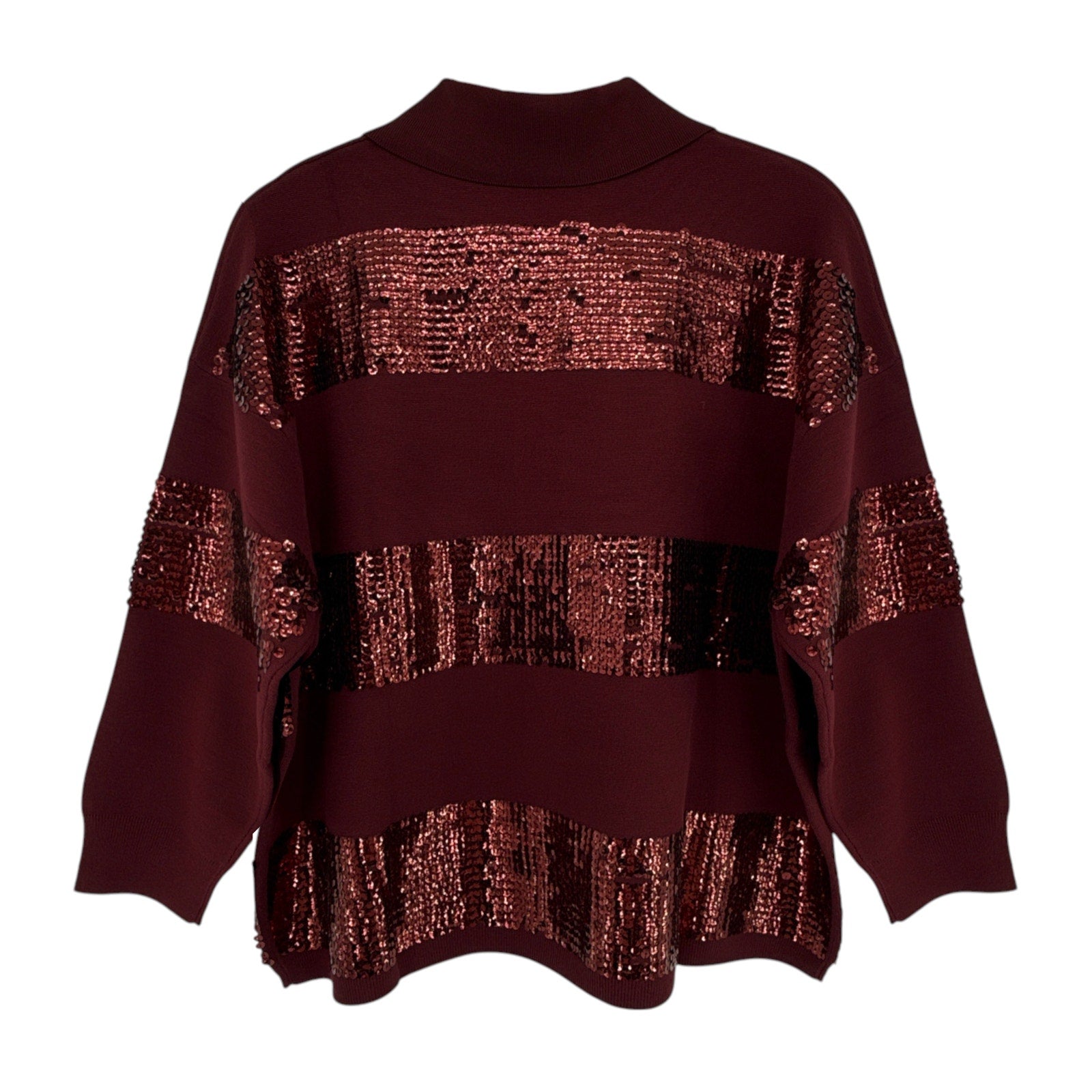 Fine-knit polo blends sporty structure with statement sparkle. Designed for a relaxed fit, it features sequin-embellished stripes across the body and sleeves, contrasted by a bold collar and placket. Dropped shoulders, 3/4 sleeves, and a subtly curved hemline add ease to the silhouette, while ribbed trims provide a clean finish.