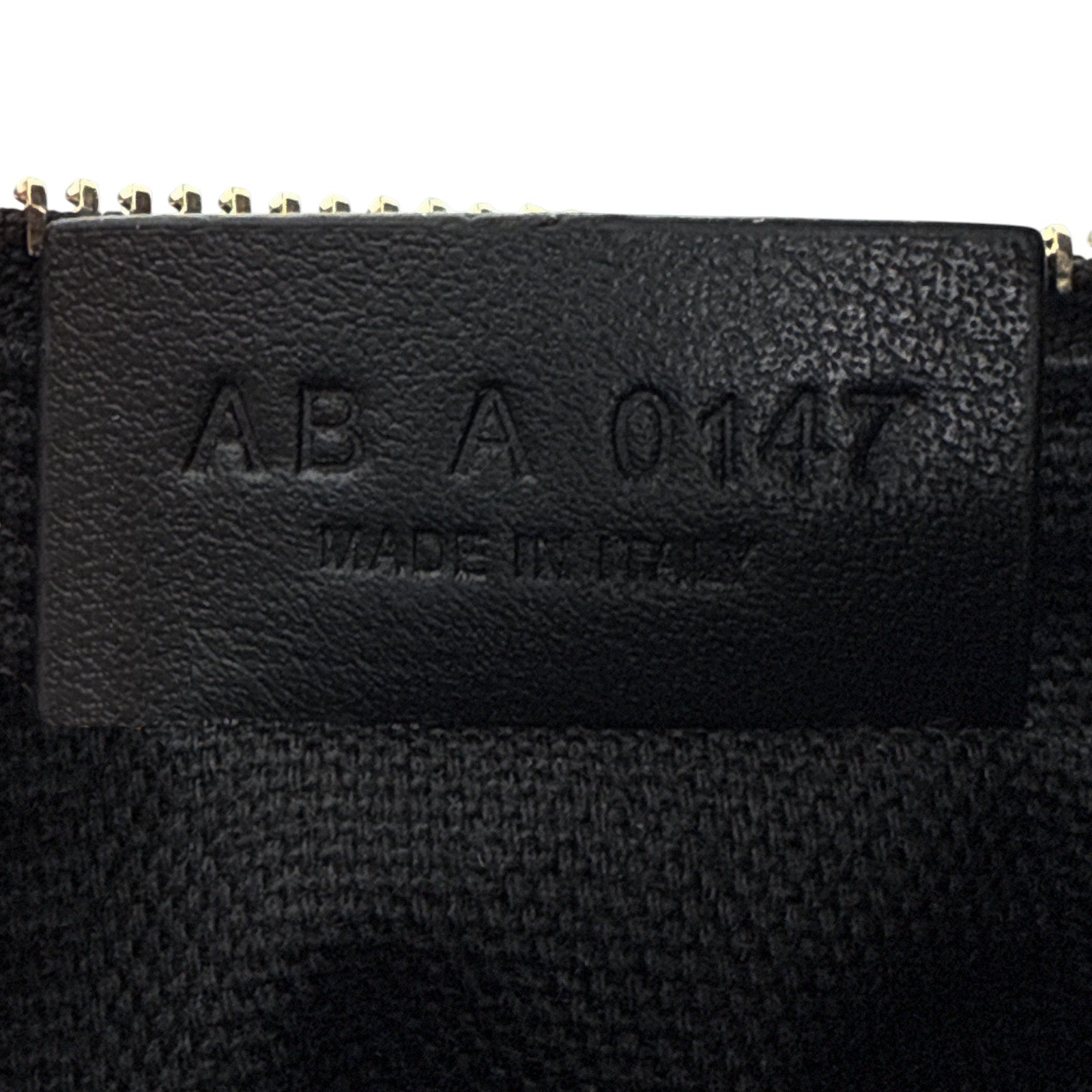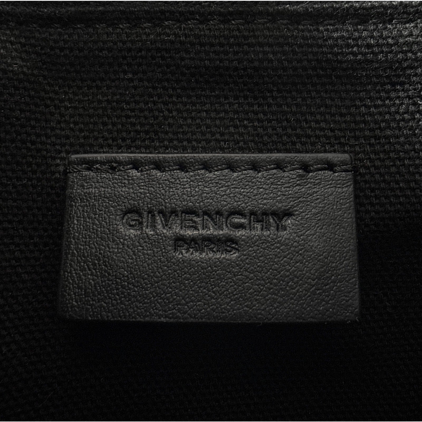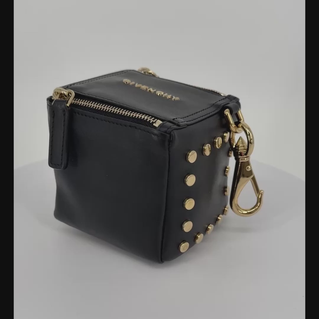 Givenchy leather pouch charm with golden hardware & lobster clasp. Dual-zip east west top; magnetic center closure. Logo lettering at top with studs at the sides.
