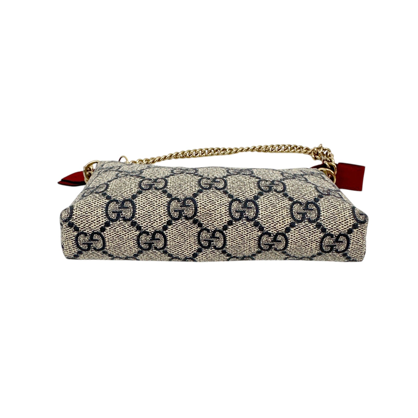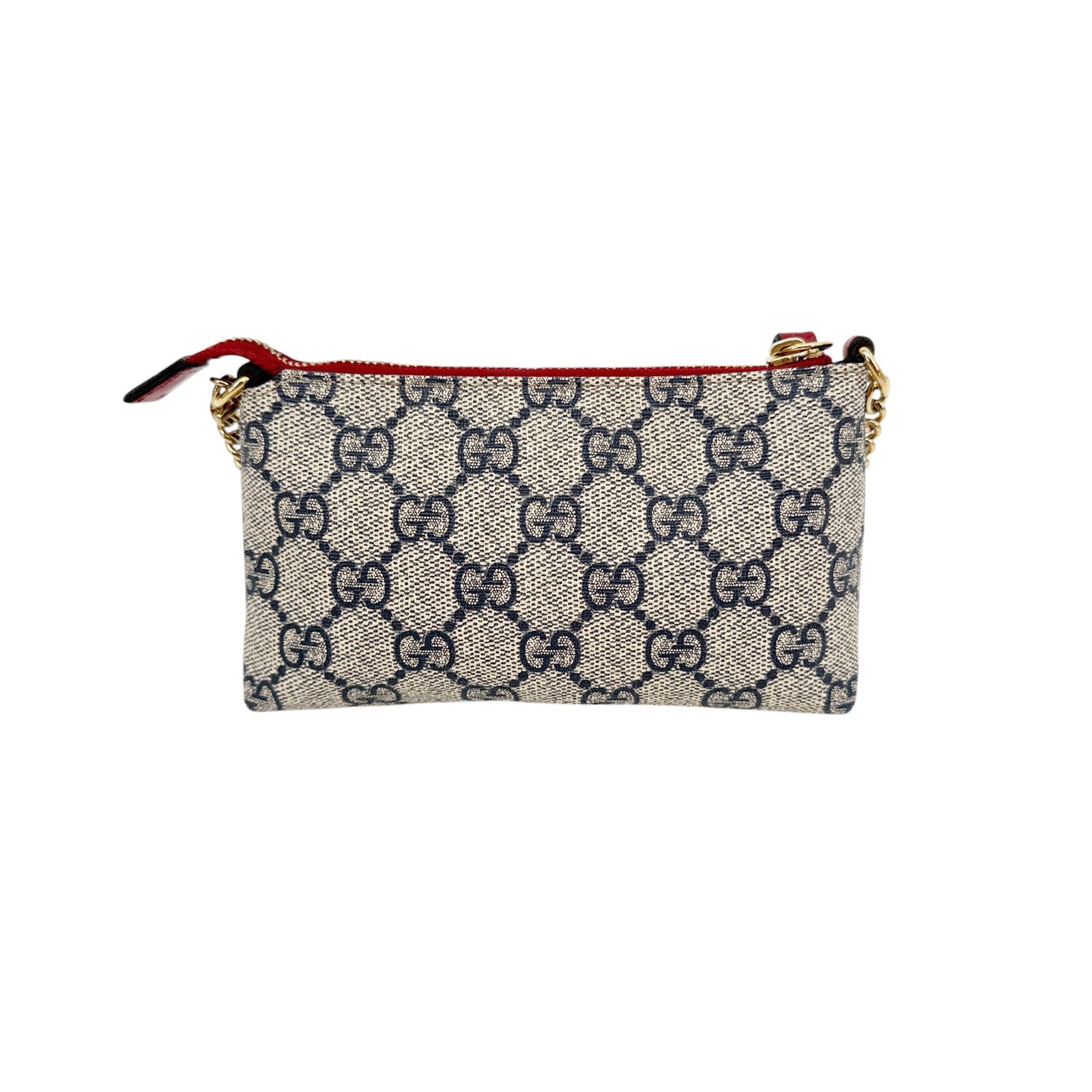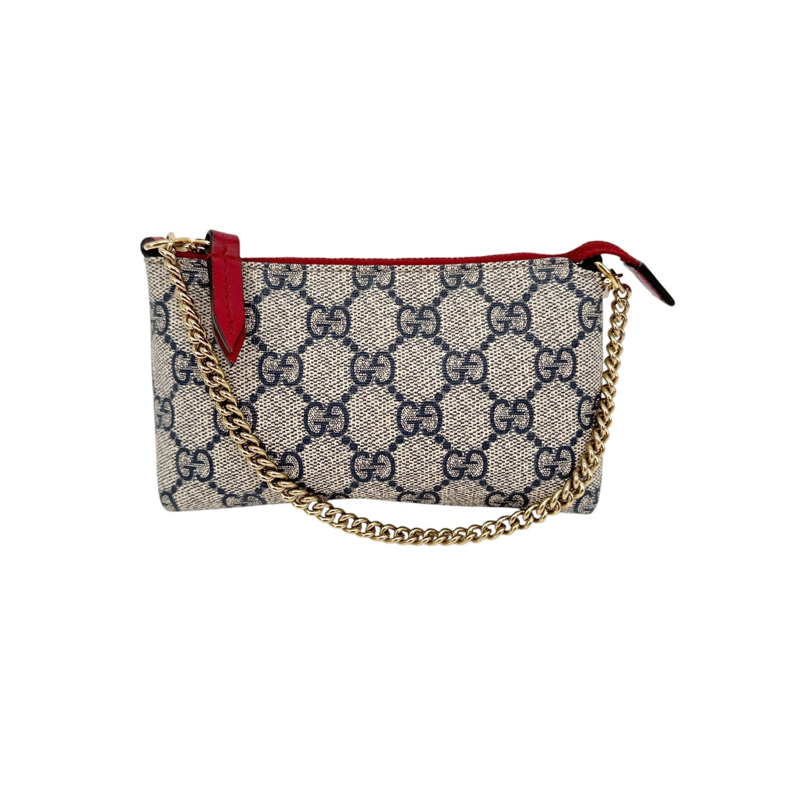 GUCCI GG Supreme Monogram Mini Chain Bag in Blue & Red. This petite pouch is crafted of Gucci GG monogram coated canvas in blue. The mini bag features polished gold hardware that includes a gold chain link wristlet strap & a top zipper.