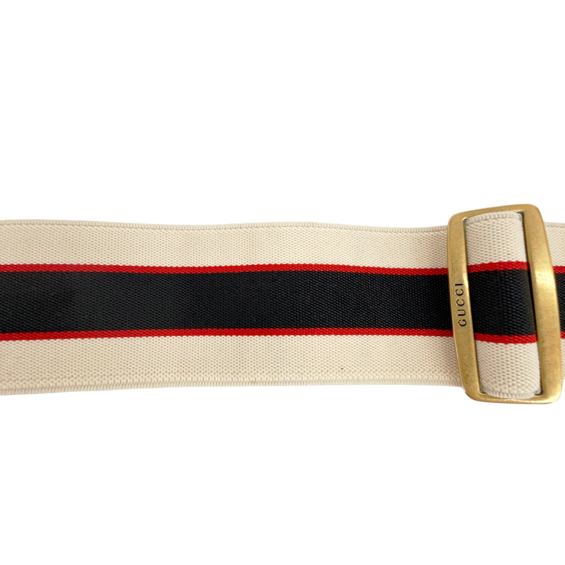 Inspired by an archival design, the Double G emblem is crafted from brass hardware with an antiqued finish. For Cruise, the logo is surrounded by sparkling red crystals, placed on a Gucci jacquard stripe elastic belt.