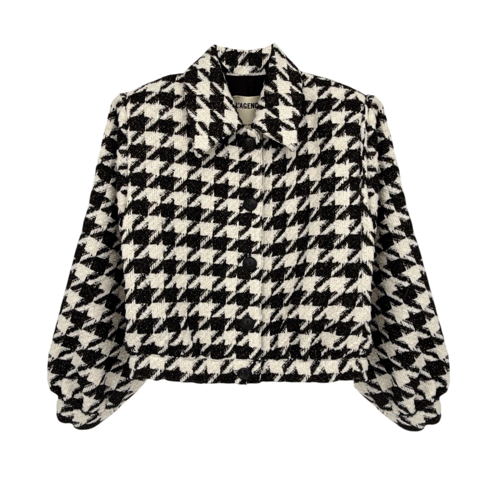 Introducing the stylish L'AGENCE Bridges Crop Jacket, perfect for stepping up your blazer game. This sophisticated piece features a chic Ecru/Black/Gold Houndstooth pattern, giving it a unique and elegant touch. A ladylike, three-quarter sleeve jacket meets an oversized, graphic houndstooth.