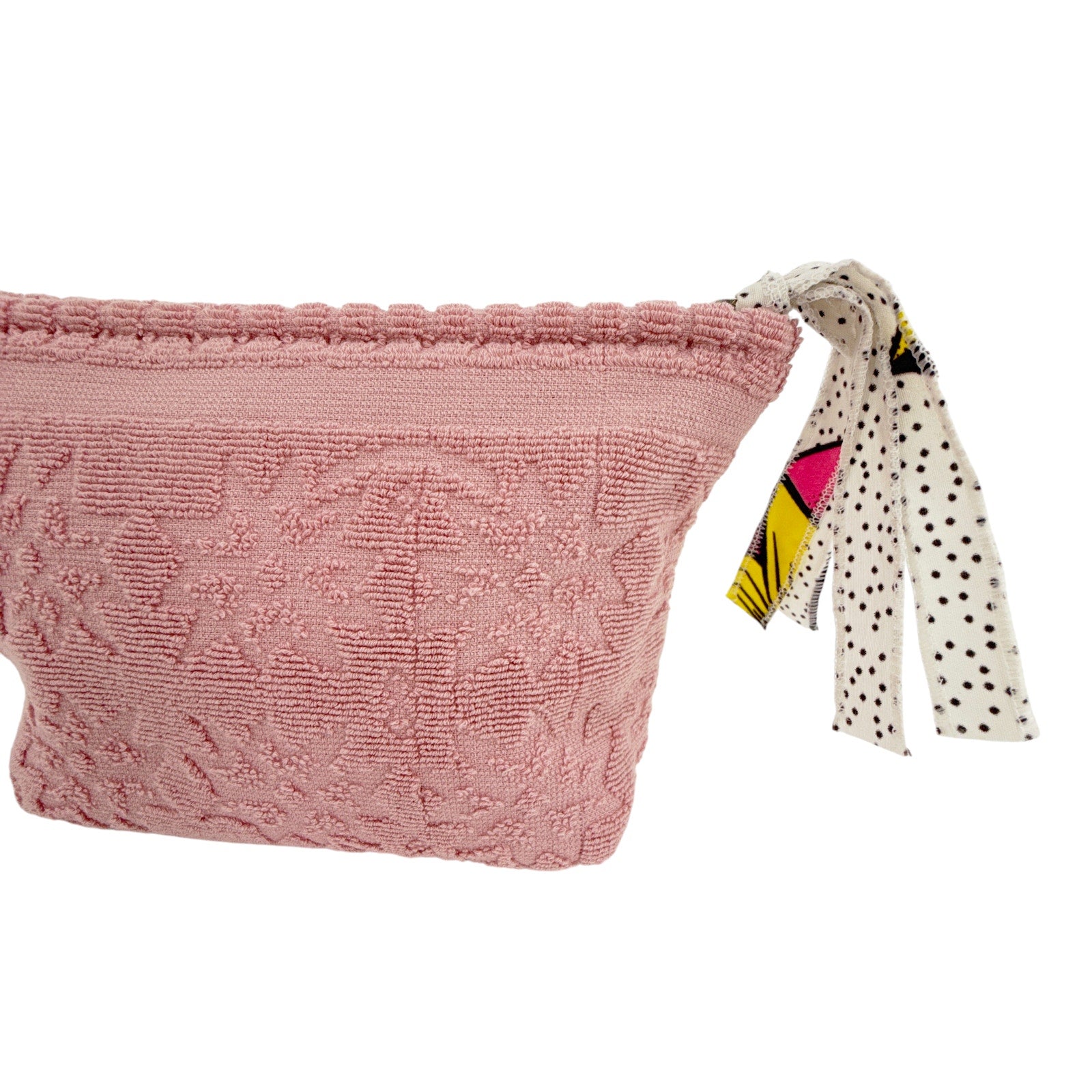 The Small Terry Clutch by Lalla is handmade in Marrakech and made from Hammam towels. Each bag is lined with a unique printed fabric and can be used as a clutch or makeup bag.