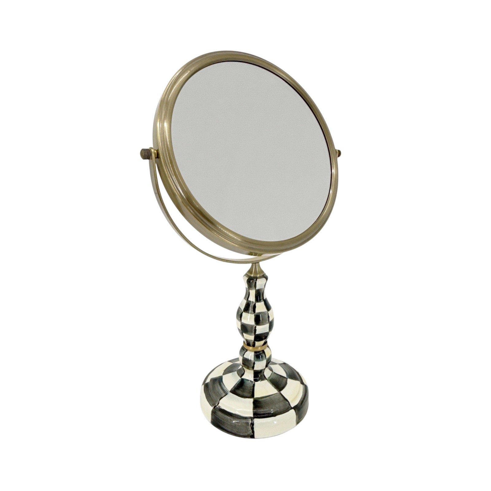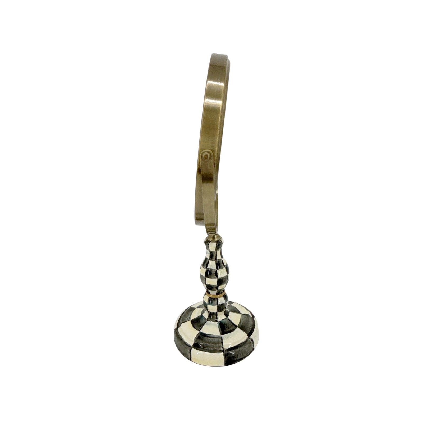 Looking your best has never looked better. Our Courtly Check® Vanity Mirror lets you get up close and personal in MacKenzie-Childs style. A two-sided circular mirror, with 5x magnification on one side, is mounted on a decoratively turned base draped in our signature pattern. For beauty routines that are anything but routine.