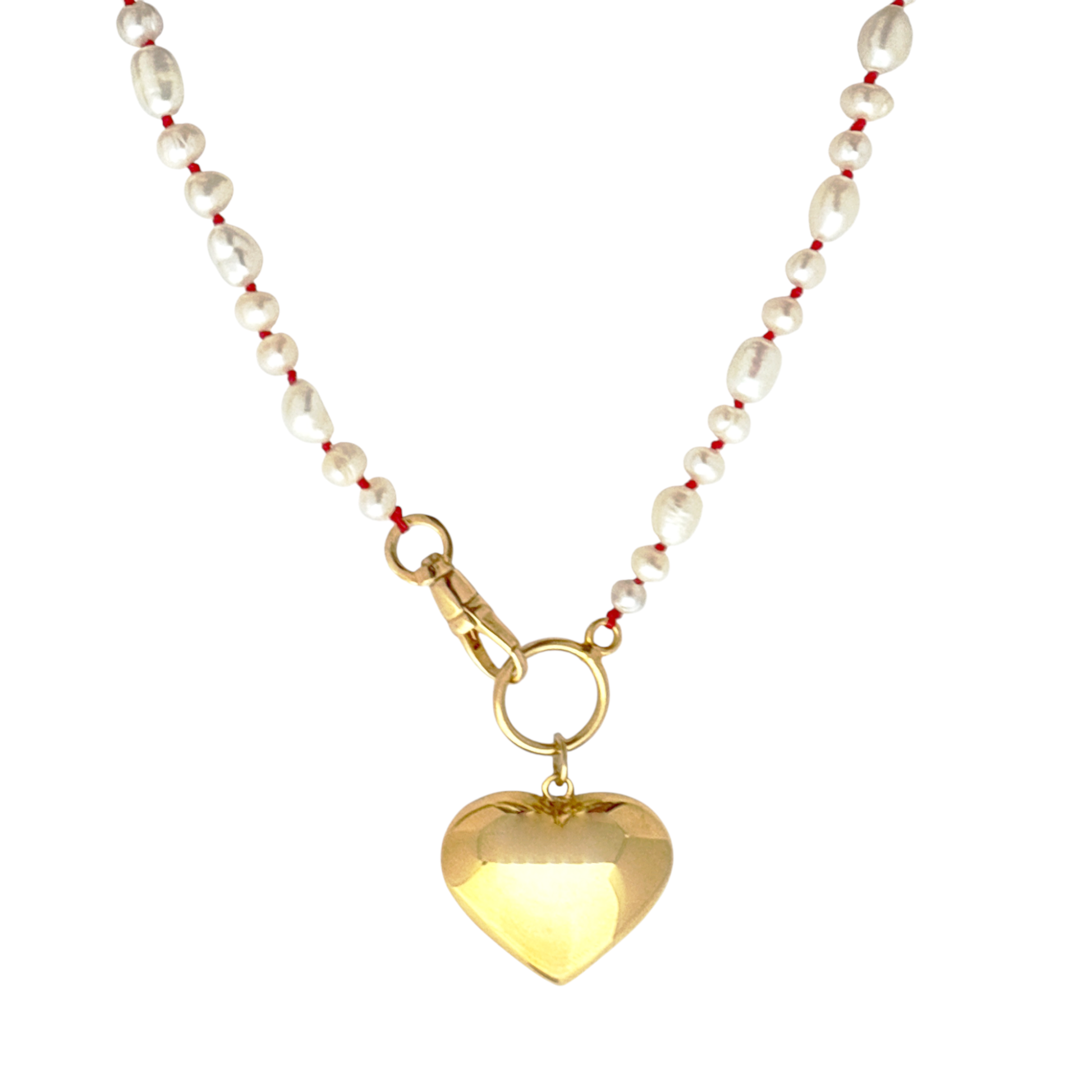 Necklace Big Heart-From their Demi Fine Jewelry Collection. Freshwater rice pearls hand knotted with 18k gold plated silver heart