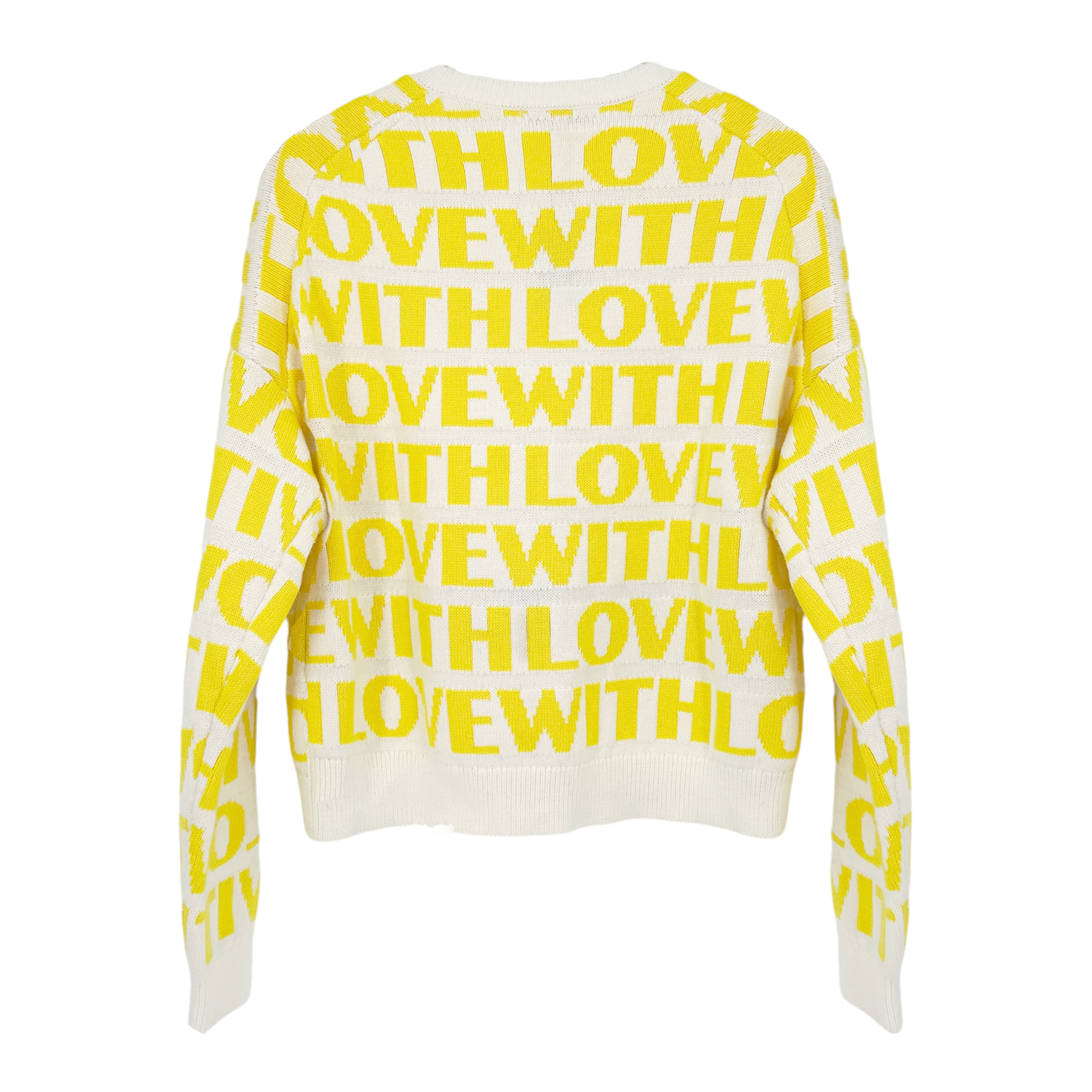 There's nothing but love for this sunny hue. Spun from a mid weight knit of acrylic & cotton, it feels somewhere between your favorite cashmere & sweatshirt, emblazoned 'With Love' & dropped shoulders. Maje knitted jumper with dropped shoulders, long sleeves, all over knitted with love pattern, contrasting 'love' at front, loose fit.