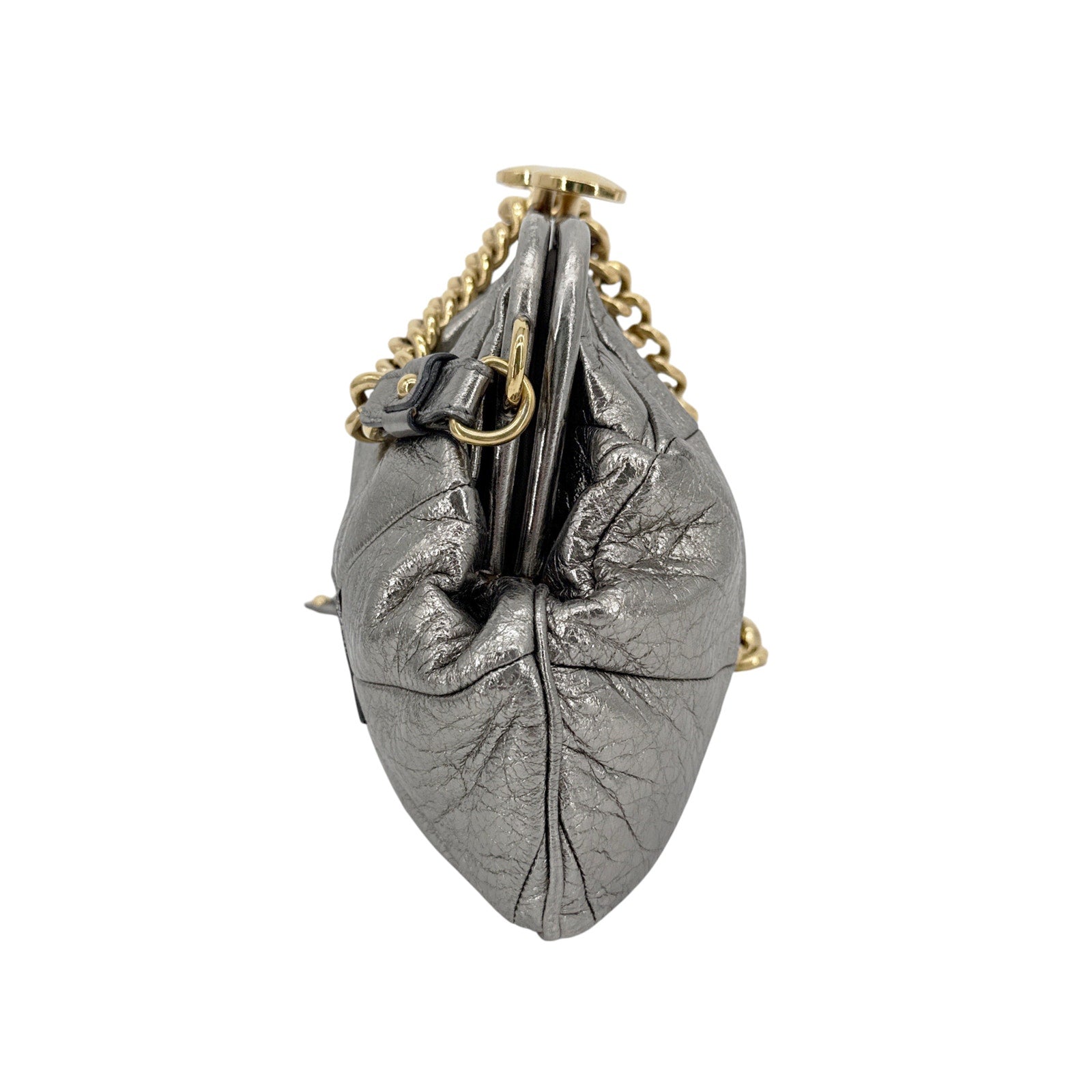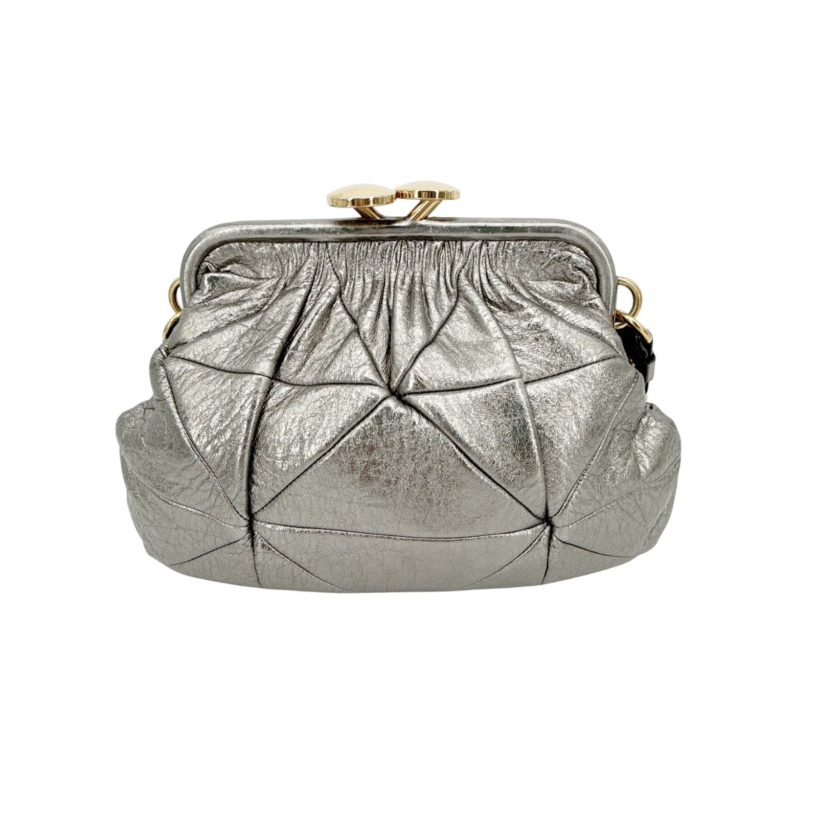 The Patchwork Stam Bag is chic & adorable. It features patchwork calfskin leather in a rich pewter/silver color perfectly balanced with gold hardware. It has an oversized kiss-lock clasp & an outer zip pocket.