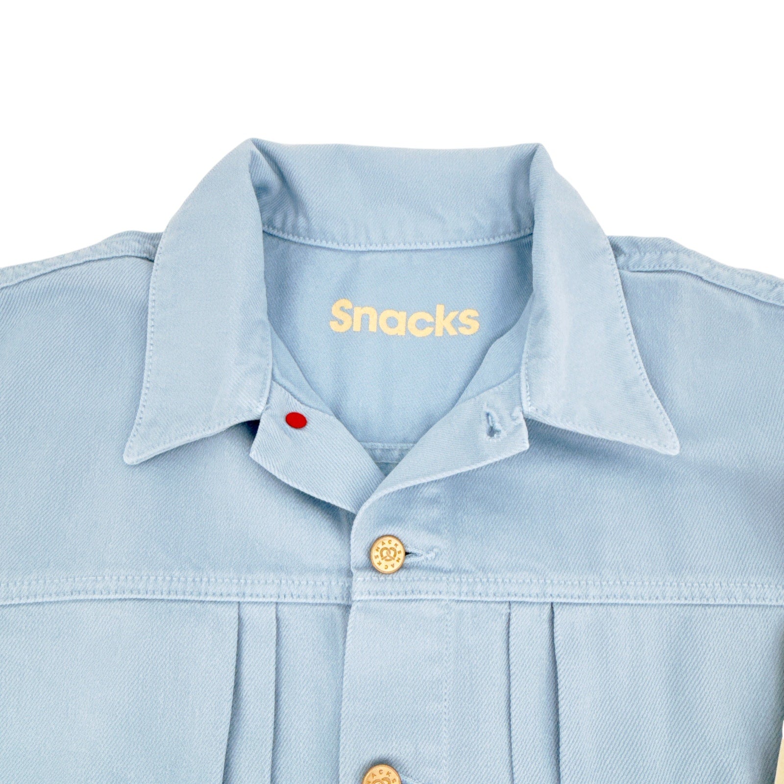 Bite me. SNACKS! From MOTHER takes cues from throwback styles of the 80s and 90s but reimagines them for a new generation. The MOTHER SNACKS! The Big Bite Jacket is a collared denim jacket.