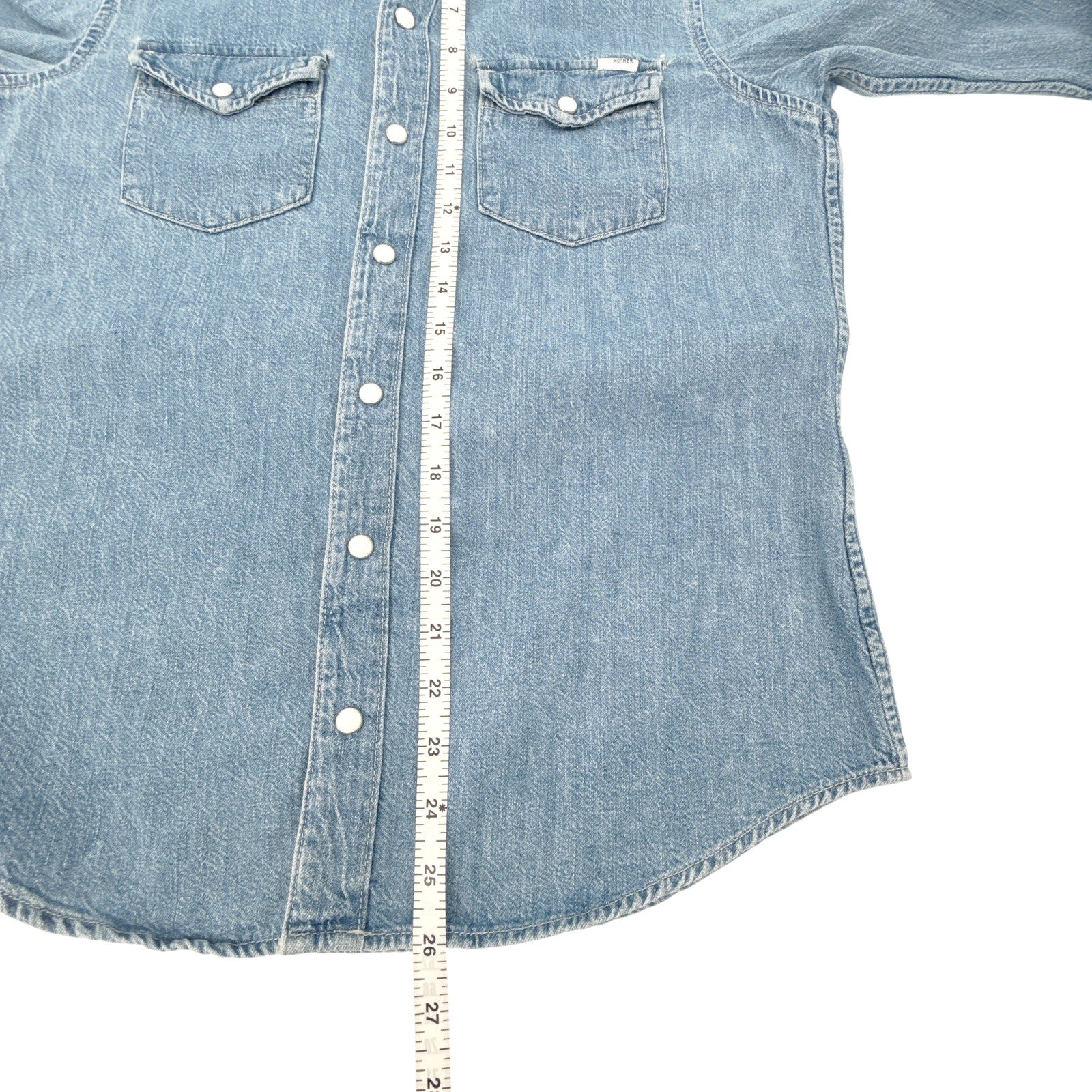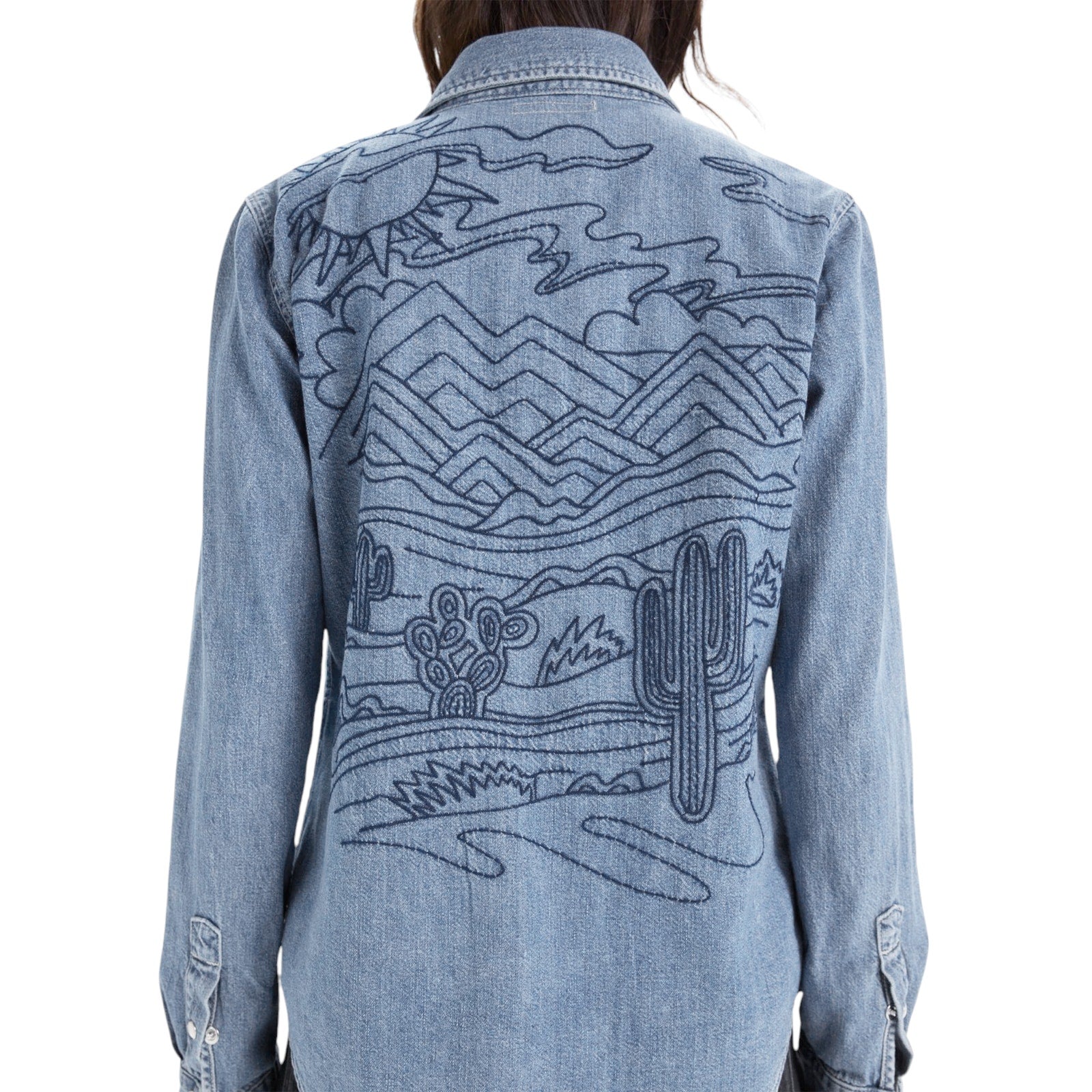 Classically cool, this denim shirt jacket is the perfect throw-on-and-go piece for the summer season and beyond. Its button-up design features a standard collar, chest pockets, and a curved hem, but the classic style stops there — take a spin to reveal the reverse, which showcases an impressive desert scene embroidered in a rich navy blue hue. Road trip anyone?