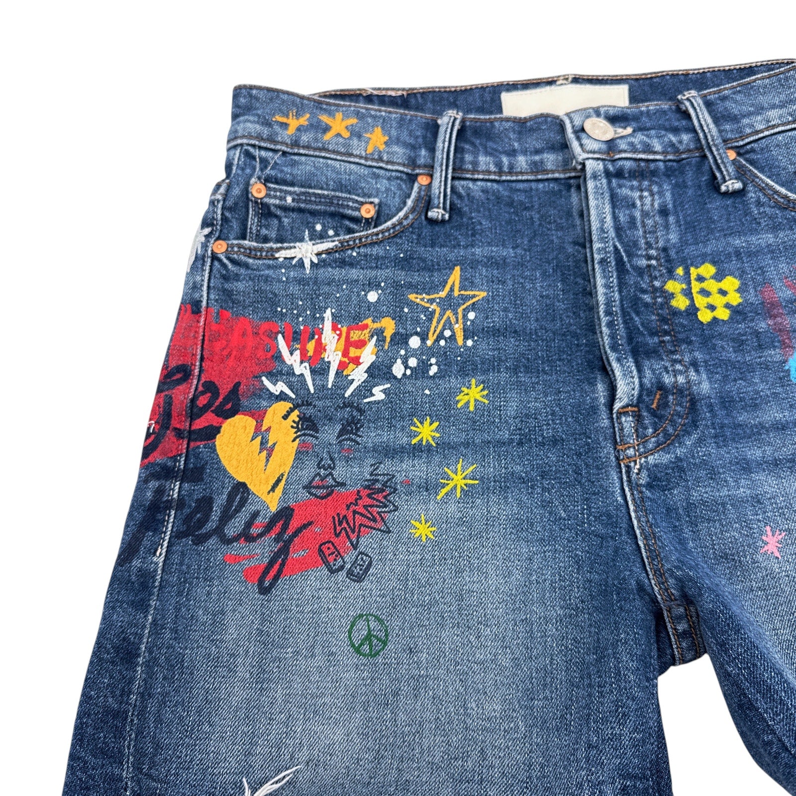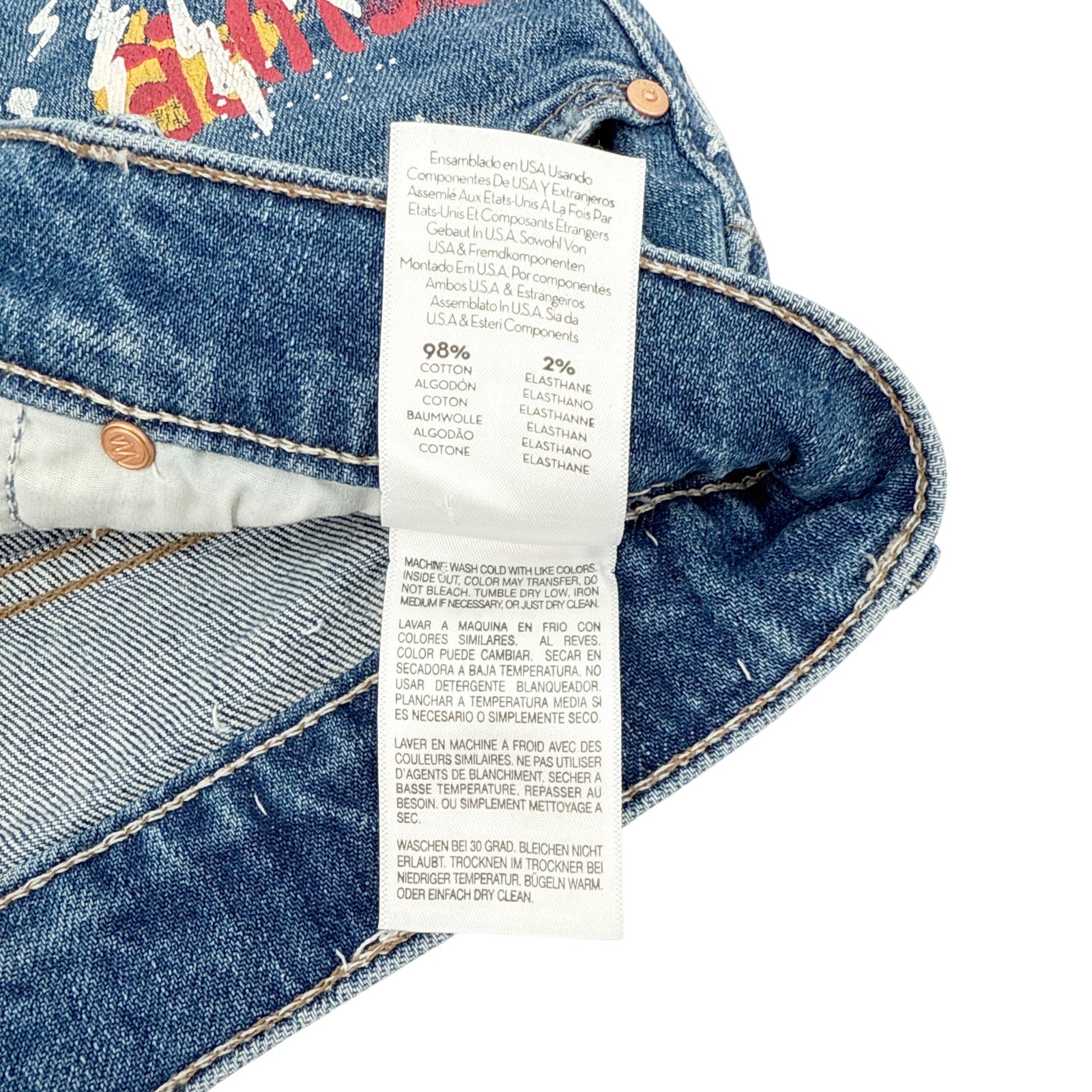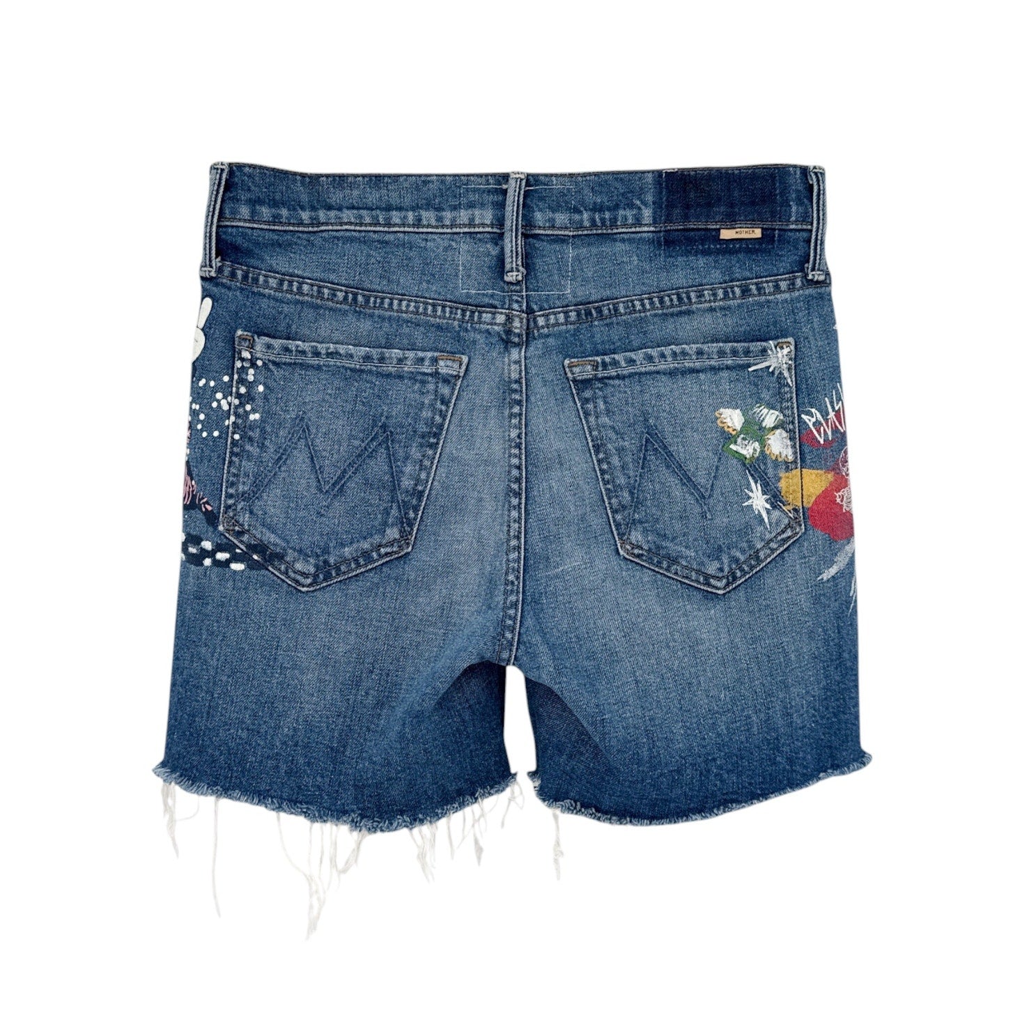 High-waist cutoff shorts of faded stretch denim are embroidered and painted for a fashion-forward look that's weekend ready.
