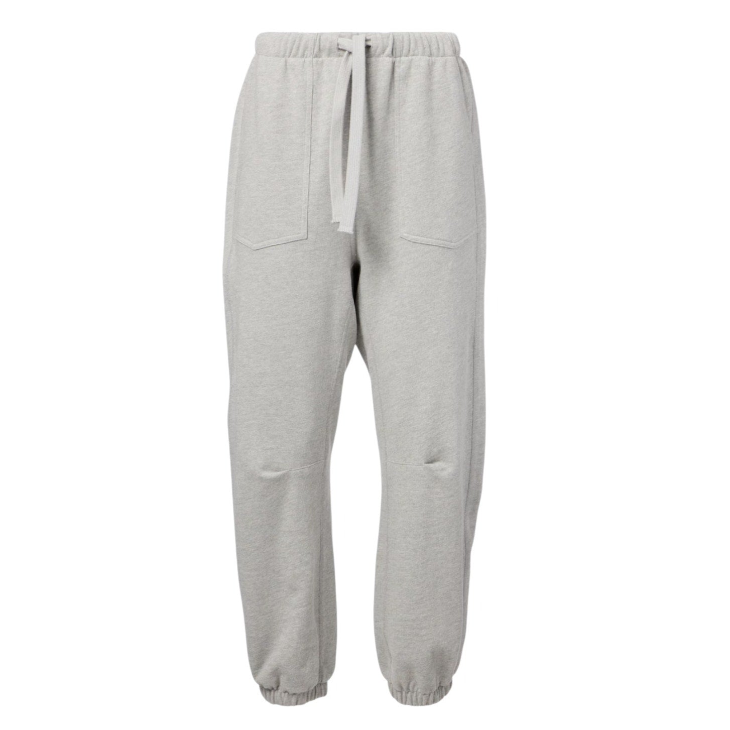 Mid-rise, relaxed sweatpant in American lightweight french terry cotton and polyester blend. Uniquely curved silhouette. Top-stitched patch pockets. Pleated seam detail at knees. Gusset at inseam. Dropped crotch. Elastic waistband with drawcord.