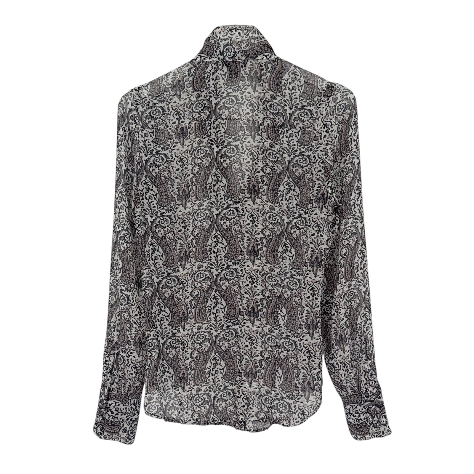 A swirling paisley print enlivens this rich silk blouse topped with a drapey neck tie.