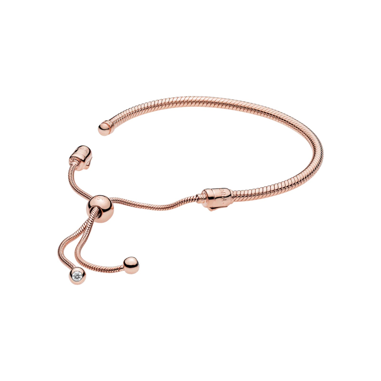 The Pandora Rose Sliding Bracelet is back with a twist! Notice the rose pink crystal on the sliding clasp and intricate buds featuring hand-printed enamel and synthetic sapphire stones.