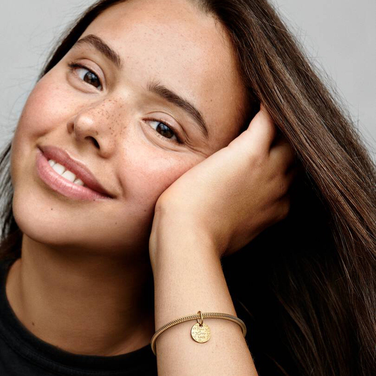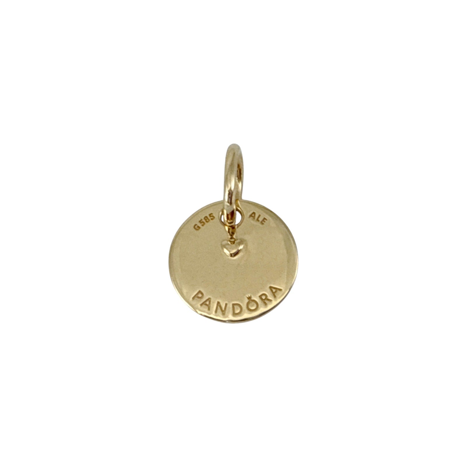 An emblem of peace, love and luck to carry with you always. This 14k solid gold charm features a round disc-shaped dangle with the engraved words "Peace Love Luck" repeated across one side in different fonts, and the other side features a raised heart and the Pandora logo. A simple yet elevated symbol of positive wishes, it makes a thoughtful gift for a loved one or a meaningful addition to your own daily jewelry rotation.