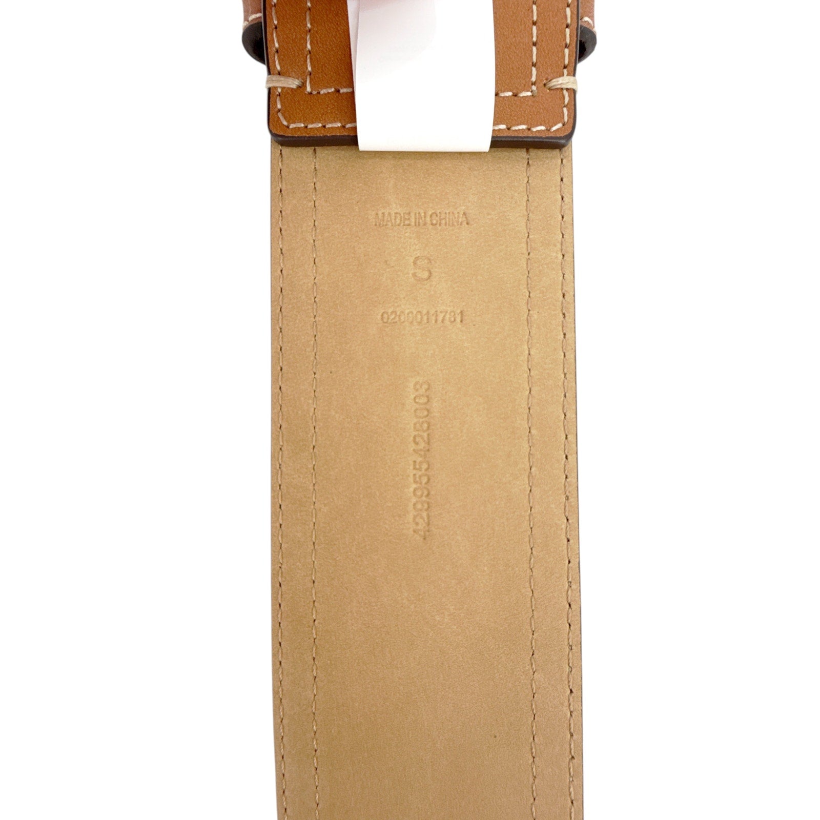 An elongated, curved buckle defines this full-grain leather belt, which is detailed with a double row of contrast stitchwork at the edges.