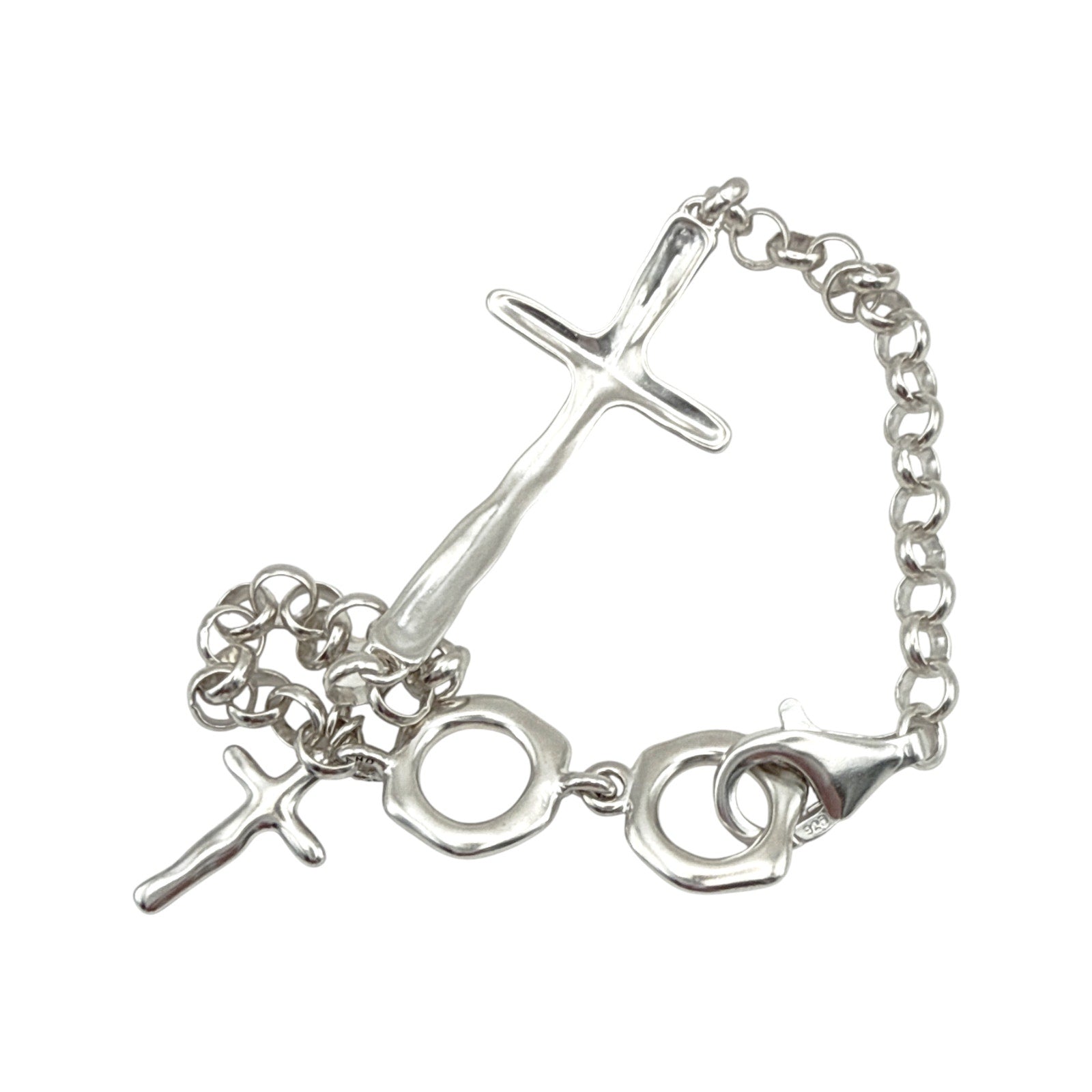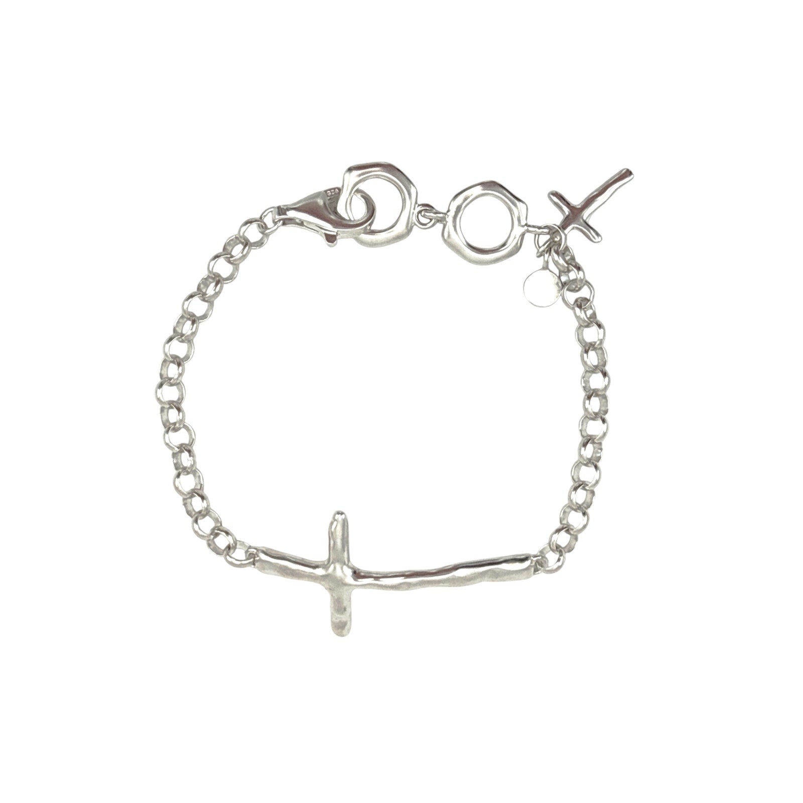 The In Good Faith Bracelet features an artistic sterling silver cross set on a bold rolo chain. A smaller cross dangles at one end. Gift one to a cherished friend and treat yourself to one of your own. Bracelet is adjustable and features a lobster clasp closure. The piece comes with a “.925” sterling silver stamp as a symbol of guaranteed product quality.