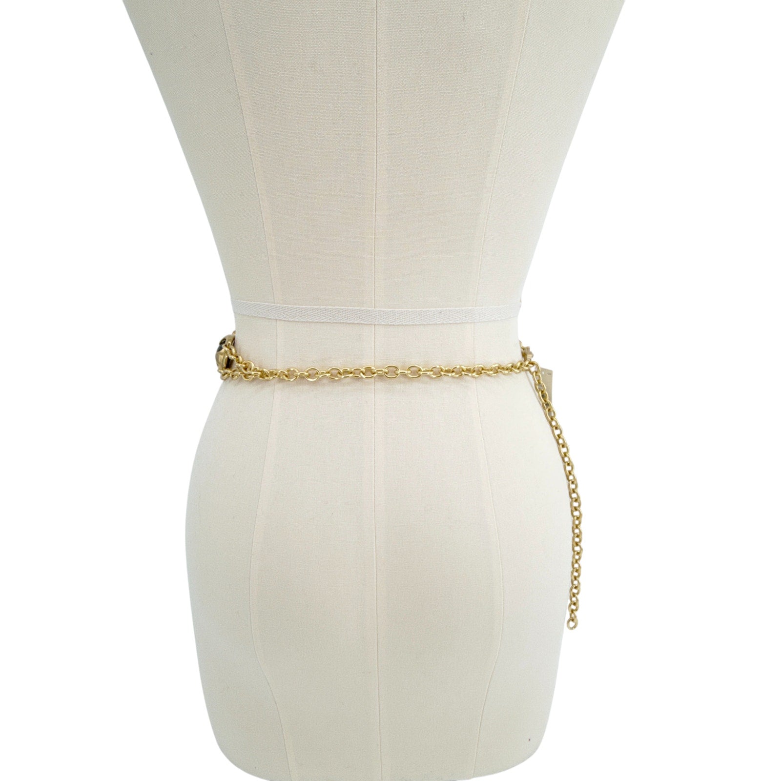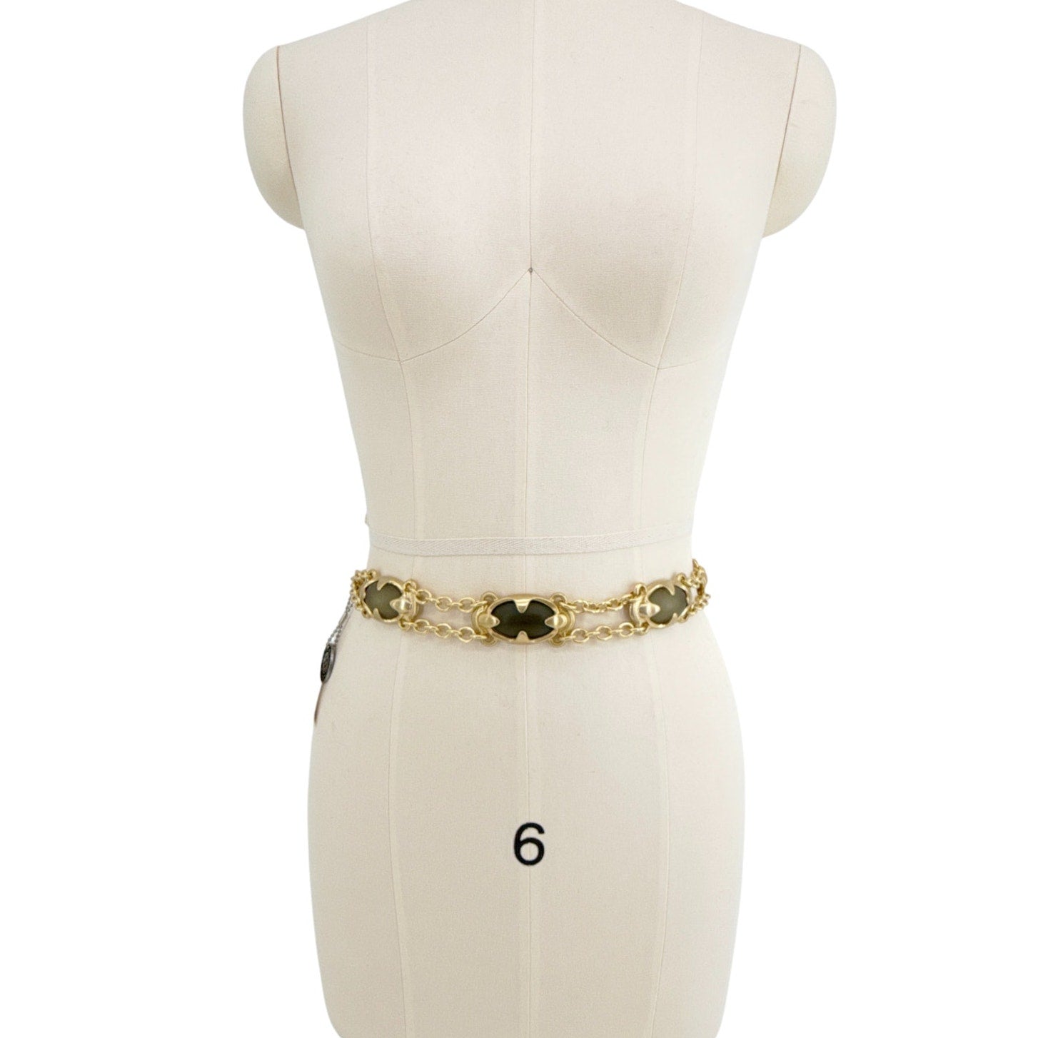 Experience an eye-catching addition to your wardrobe with this Tink Chain Belt. Crafted with beautiful gold chain links and green resin stones, this statement piece is an ideal way to complete your outfit. The belt is secured with a clasp closure for a comfortable and adjustable fit.