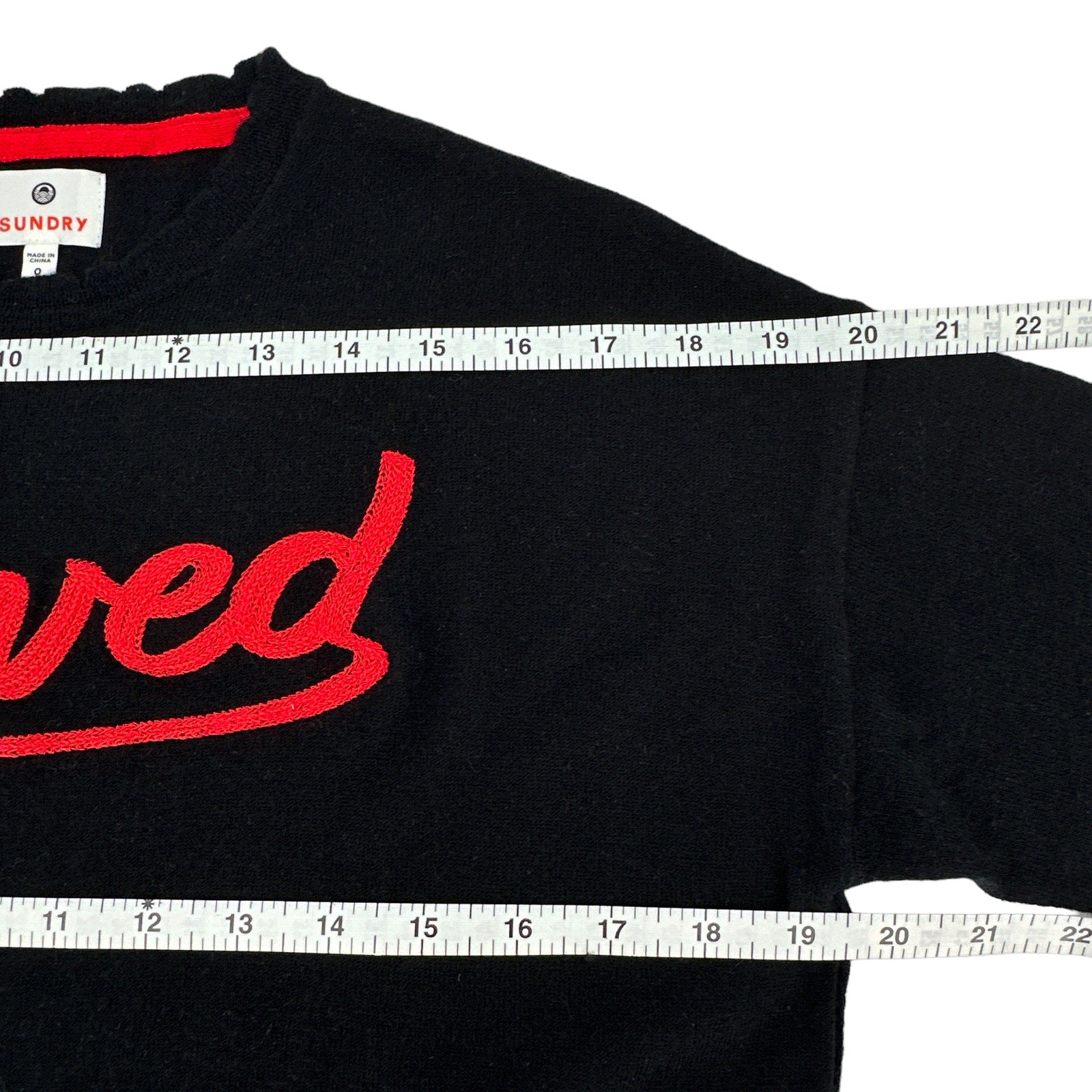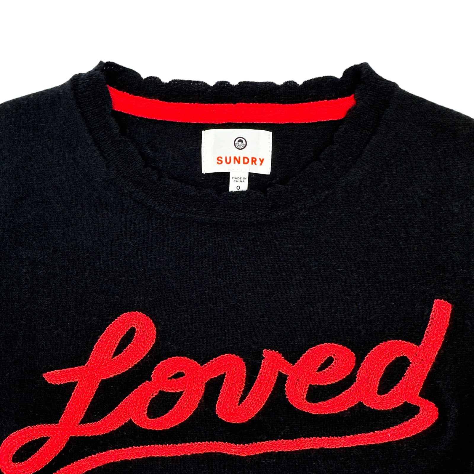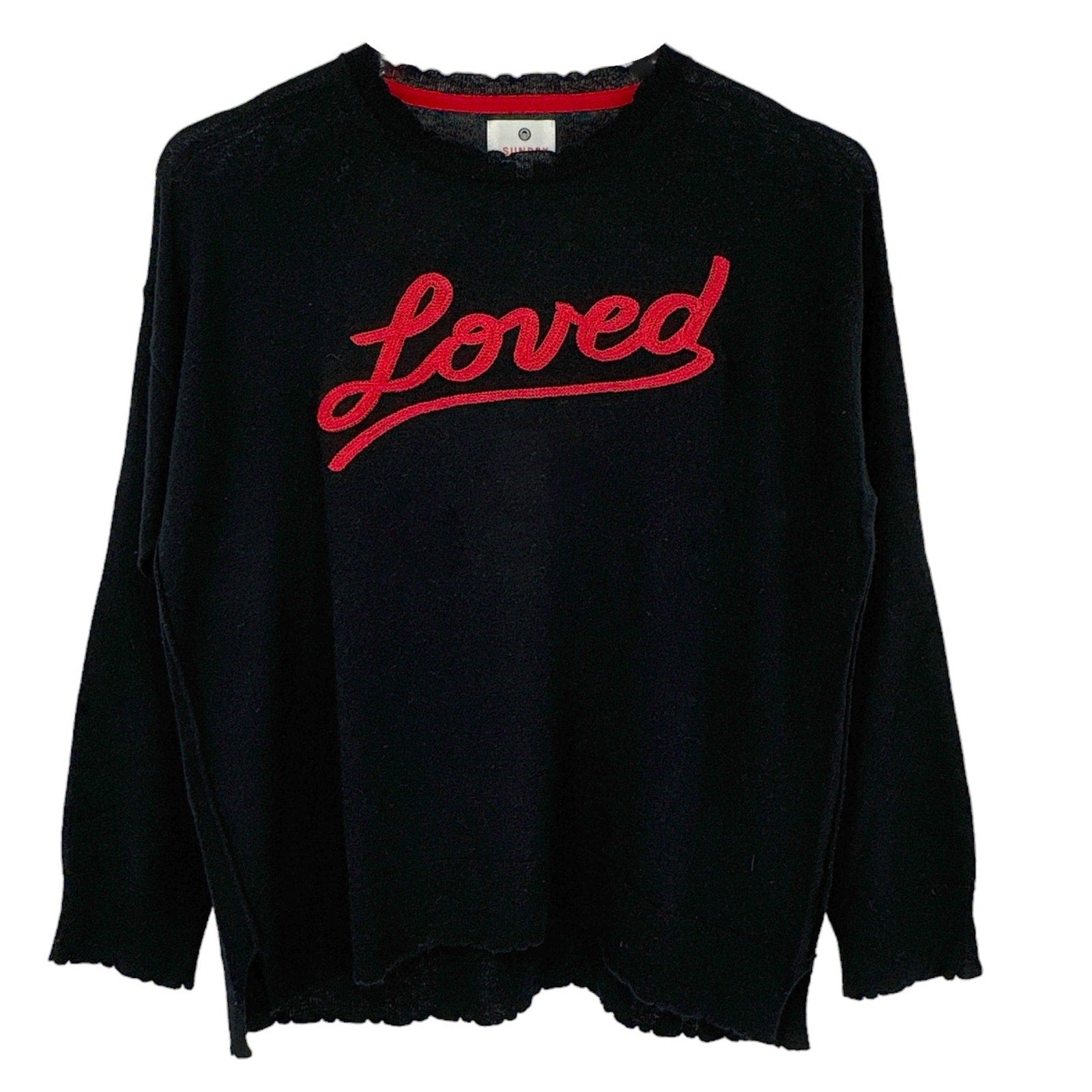 Sundry sweater with embroidered "Loved" script.