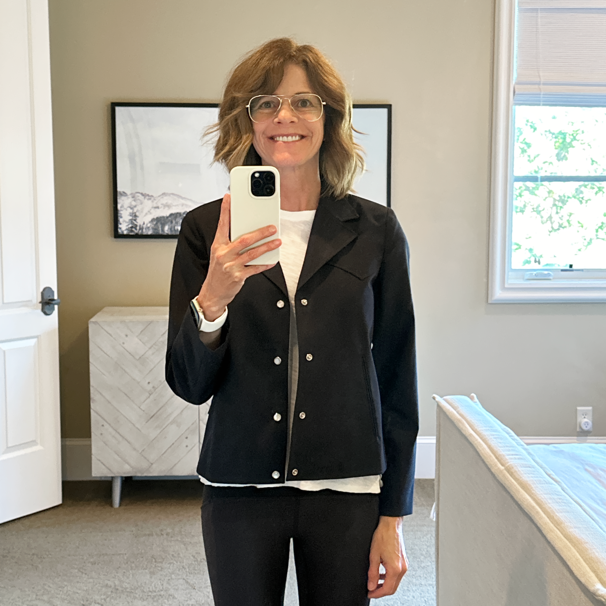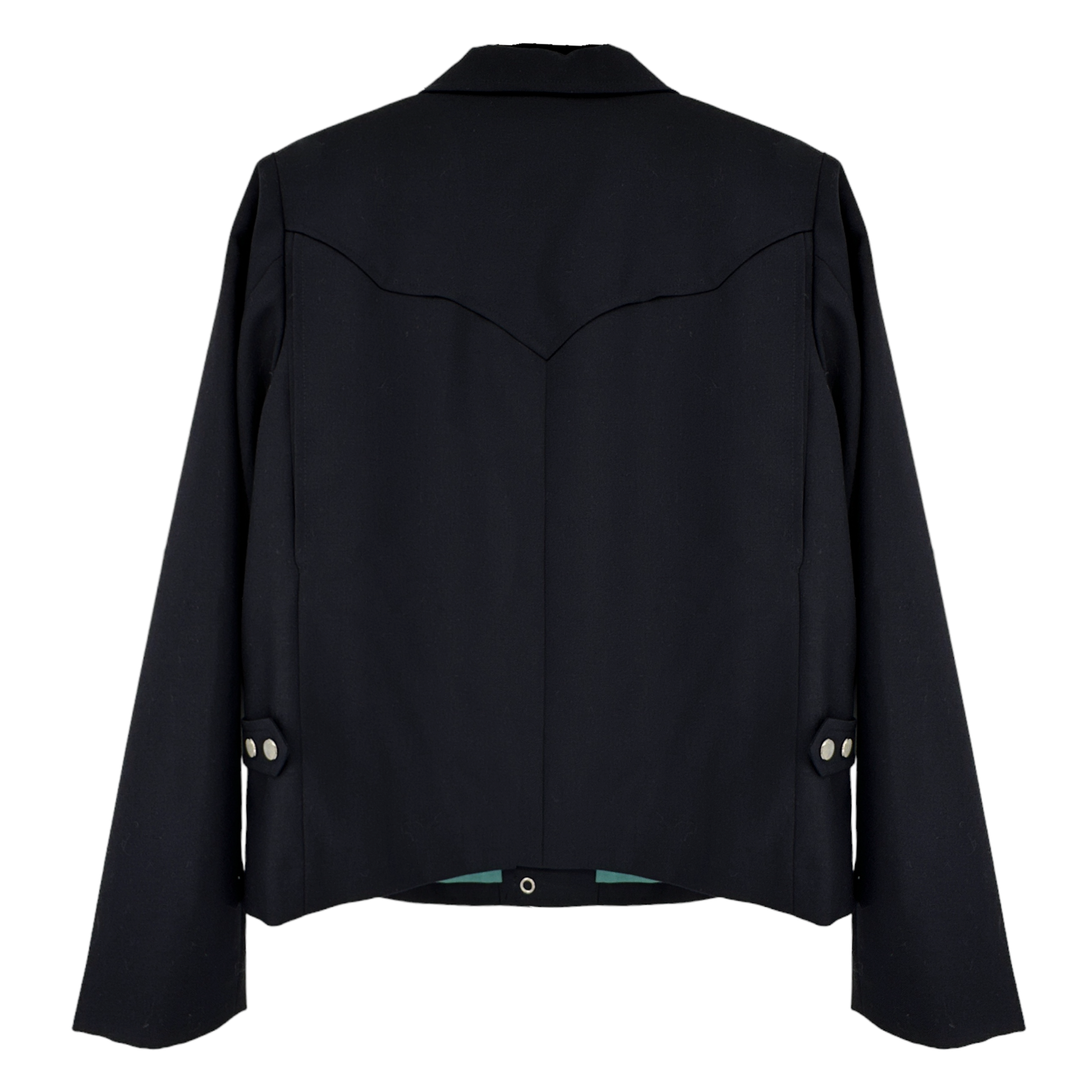 This navy blazer from The Great is a striking homage to Western wear. Its structured wool-poly blend fabric & bright satin lining make for a boxy fit with ornate yoking & seaming, a notch collar, back vents, & pearlized snaps. The adjustable side tabs ensure you get the perfect fit every time.