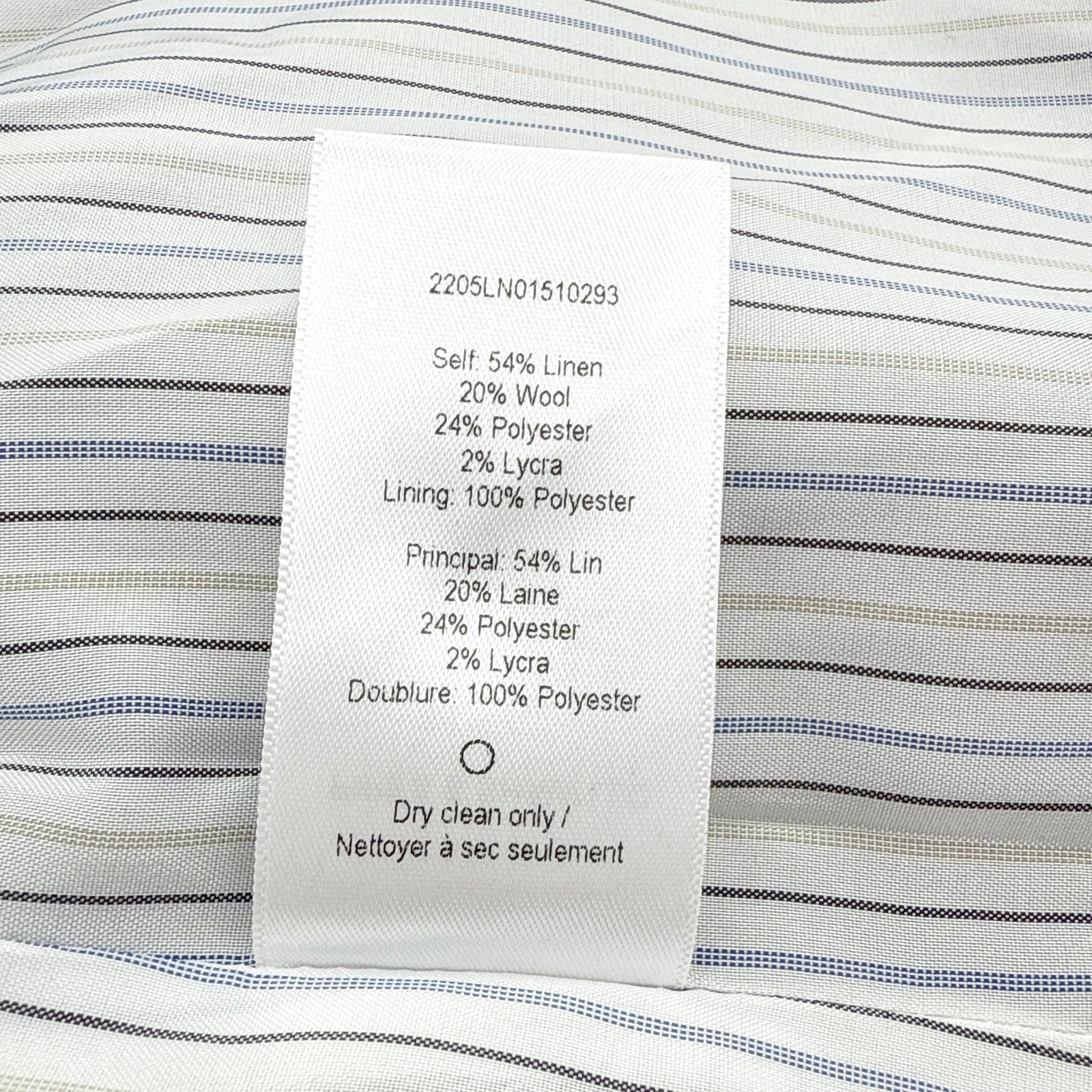 Self: 54% Linen, 20% Wool, 24% Polyester, & 2% Lycra