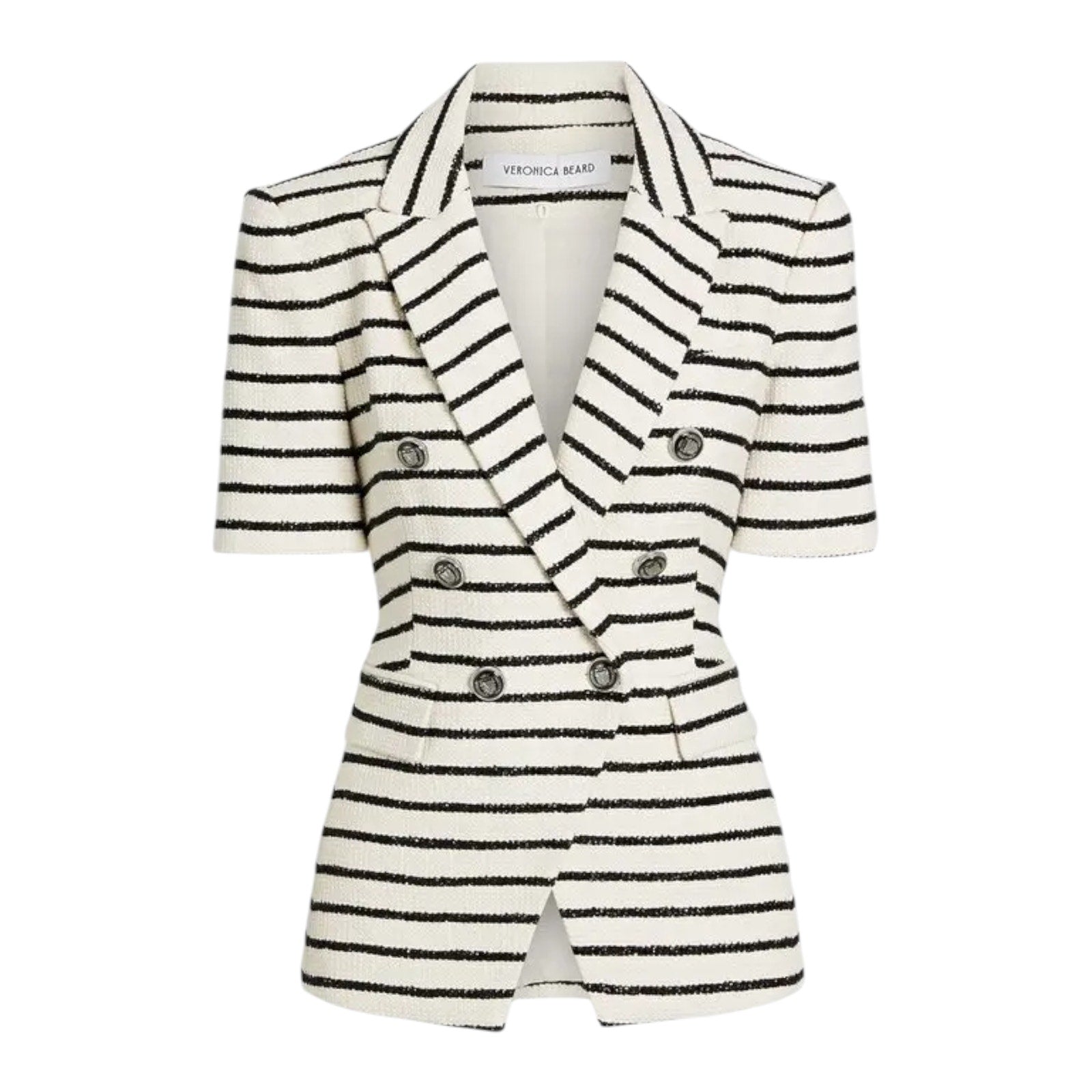 Veronica Beard's original collections centered around the 'Dickey' blazer years ago, and it's still one of the label's signature pieces. This Veronica Beard jacket is crafted from striped cotton-blend tweed. The double-breasted silhouette features shoulder pads, a breast pocket, front flap pockets, button fastening, full lining, and a back vent.