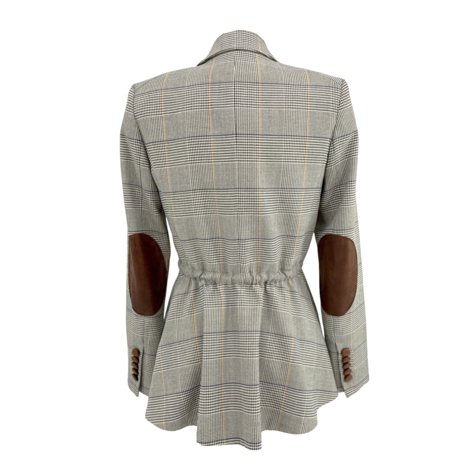 Classic plaid with modern touches. Single button front closure with adjustable drawstring waist & leather elbow patches.