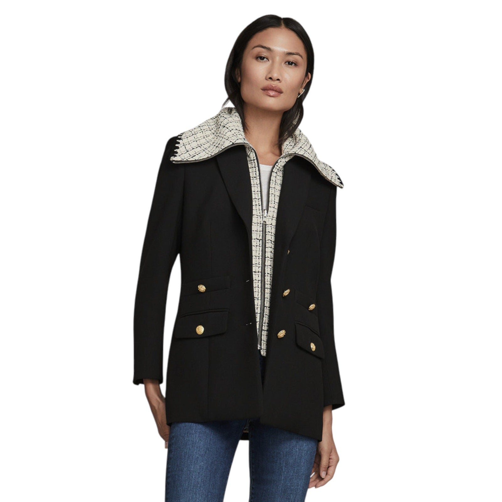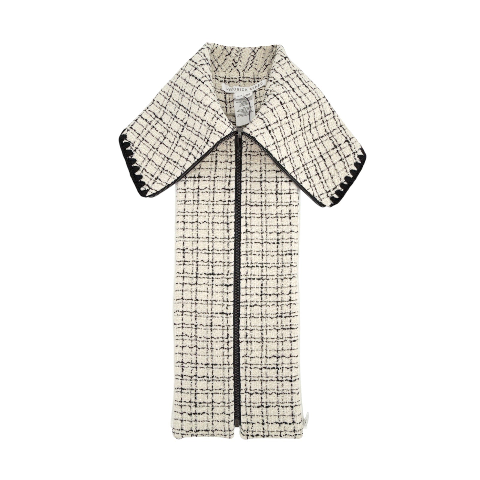 The tweed Piney dickey from Veronica Beard gives your dickey jackets a layer of warmth and style. Black embroidery stitches finish the oversized collar of this must-have piece.