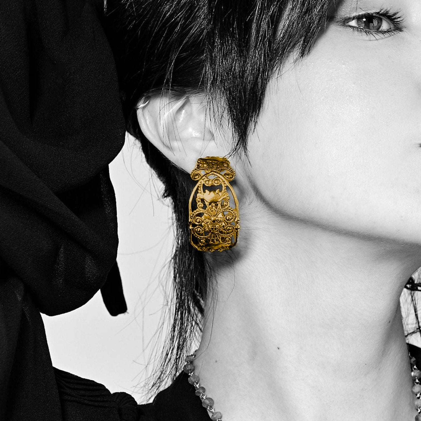 Delicate as devotion, bold as belief—the Antigua Collection draws inspiration from the intricate lace once worn by statues of the Virgin in centuries past. These sacred textiles, symbols of reverence and grace, are reborn in this collection as finely detailed metalwork.