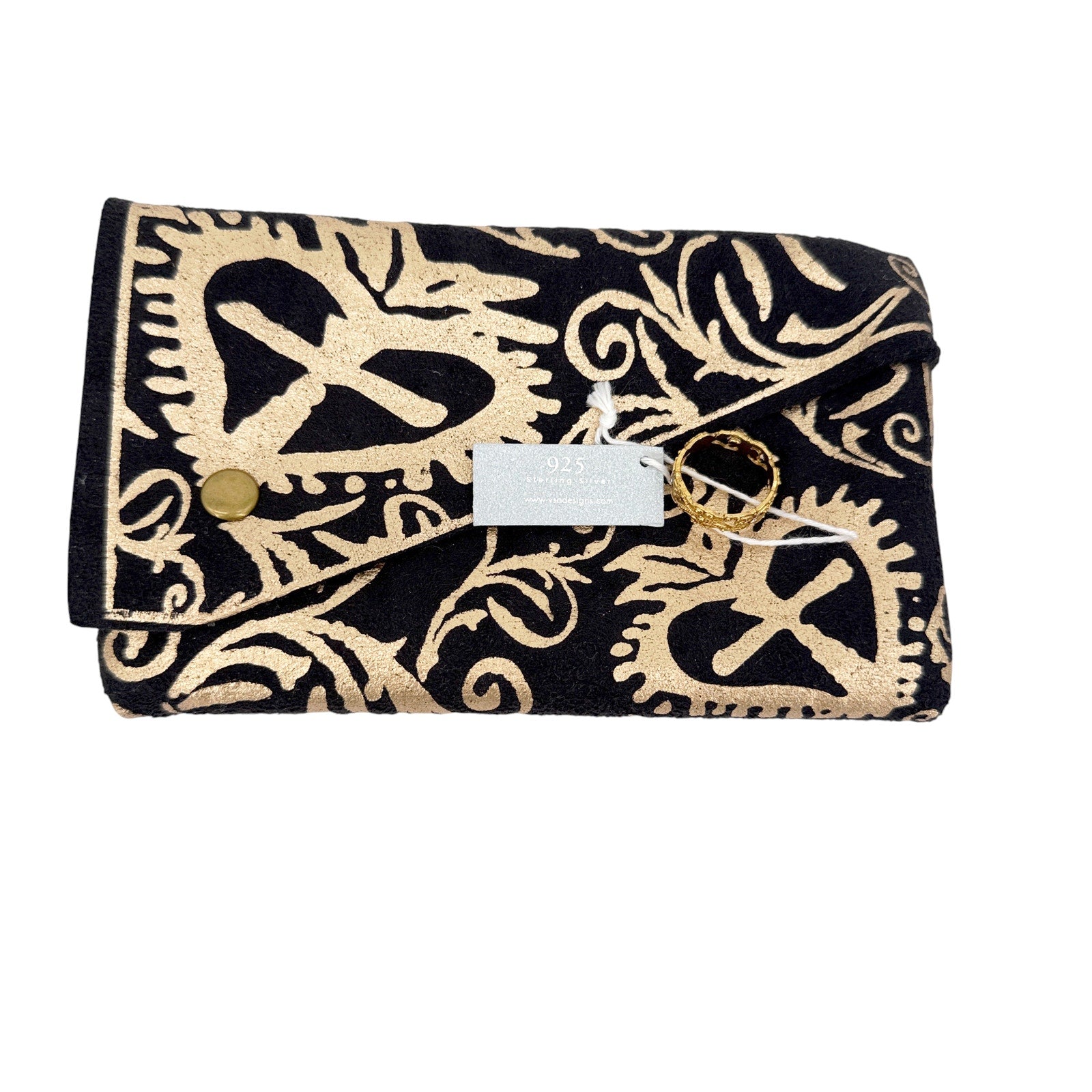This band ring is precious. Made of gold plated sterling silver encrusted with our logo and set crystals, it is a perfect layering ring. A fun addition to any ring party!
