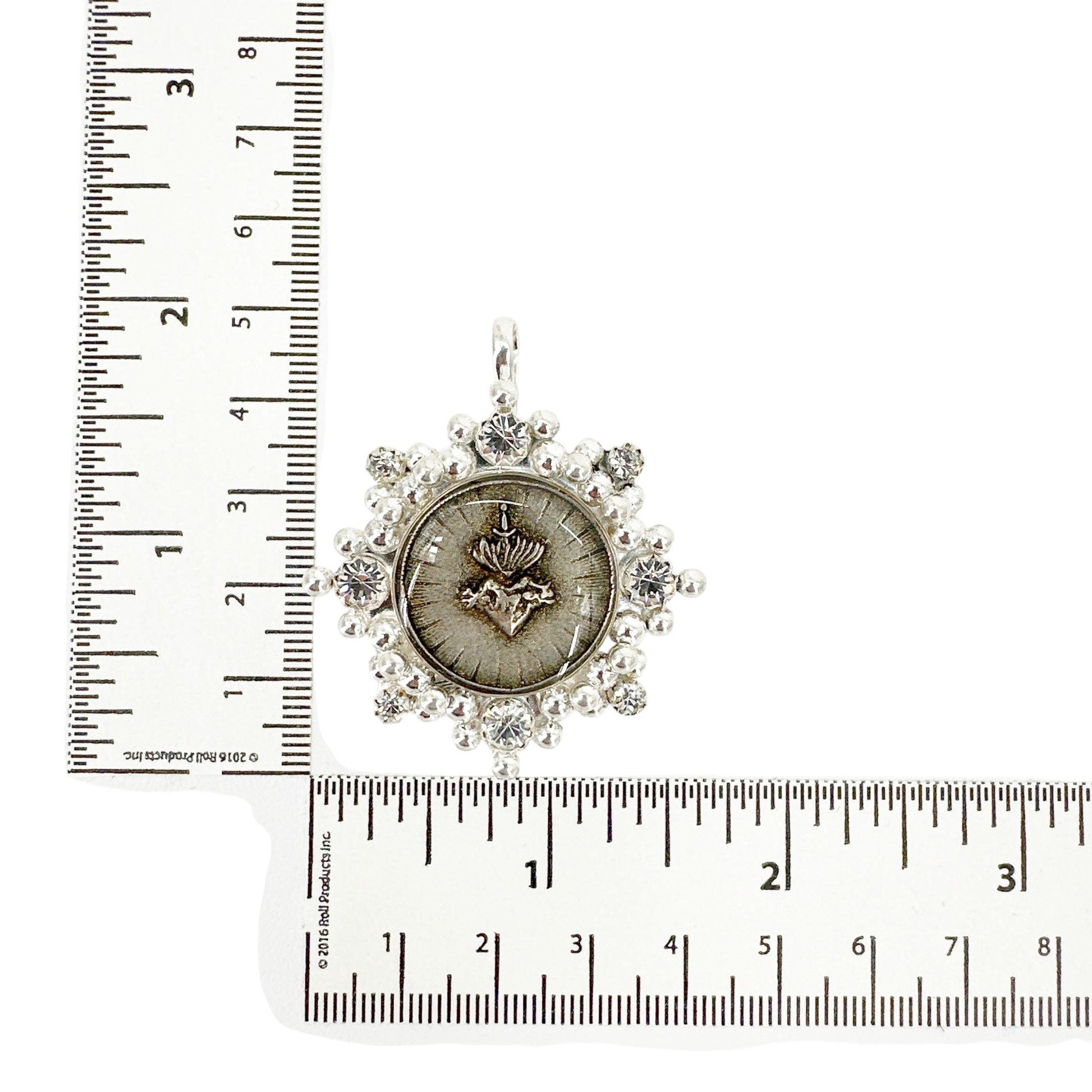 The Cloister collection draws inspiration from centuries of spirituality, superstition, & the allure of good fortune. Inspired by the eternal flames of divine love, the Sacred Heart Medallion is adorned with exquisite Austrian crystals, a shimmering testament to the enduring power of love's fervent blaze.