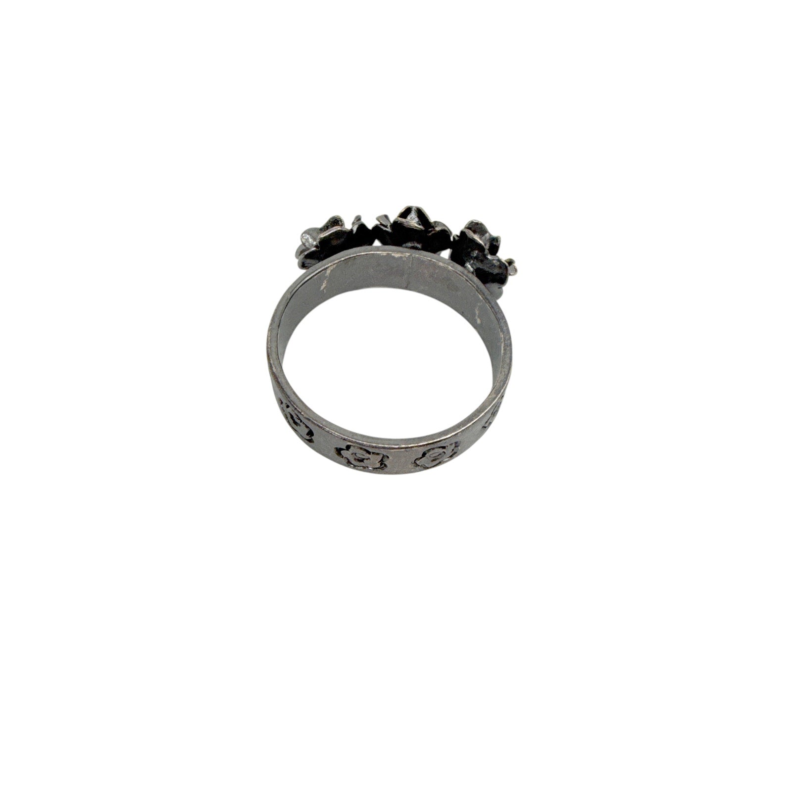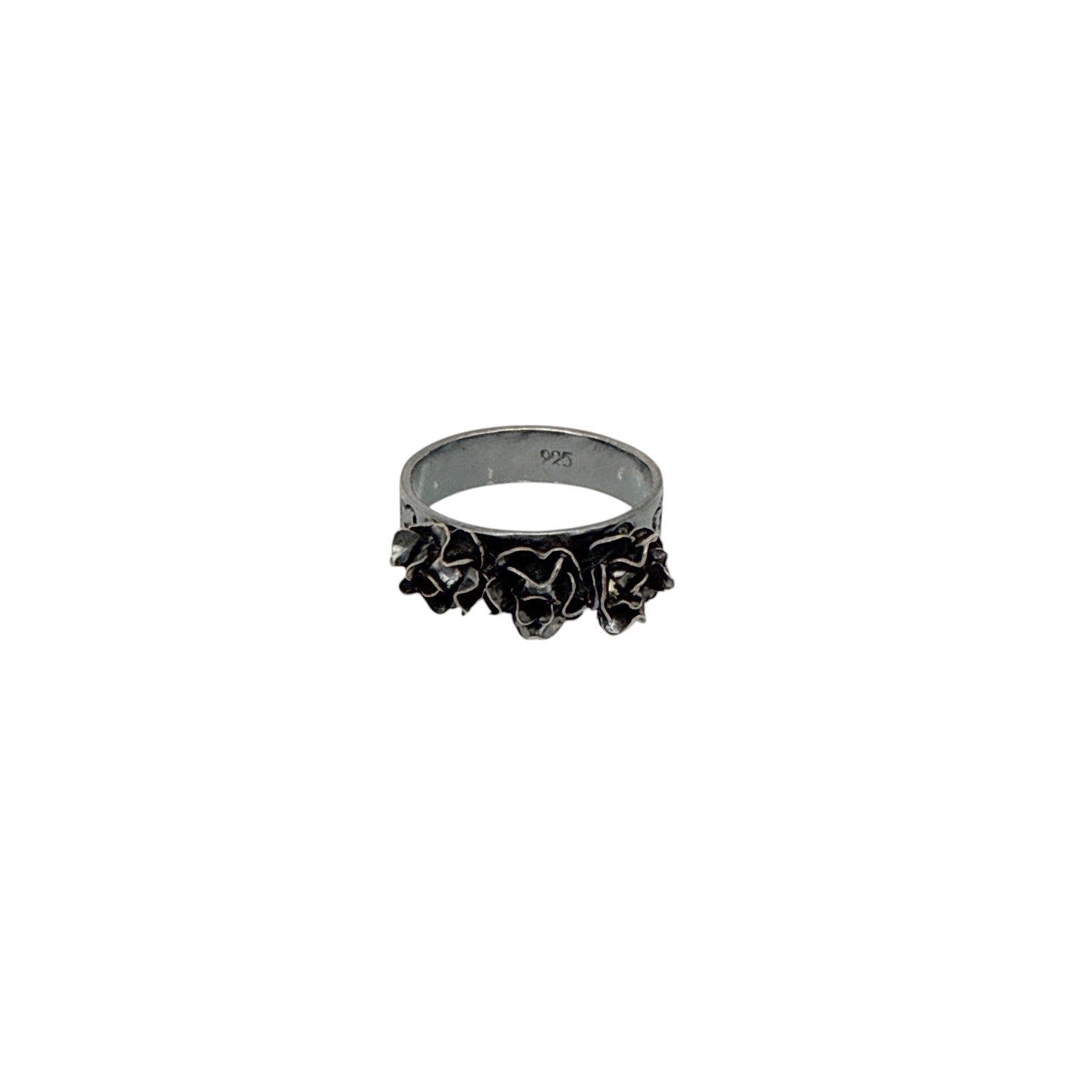Each piece in the collection was named for the characters that wore them. This ring was named the Stepsister ring. A perfect stackable ring with three roses in a row, each with an Austrian crystal center.